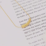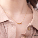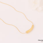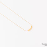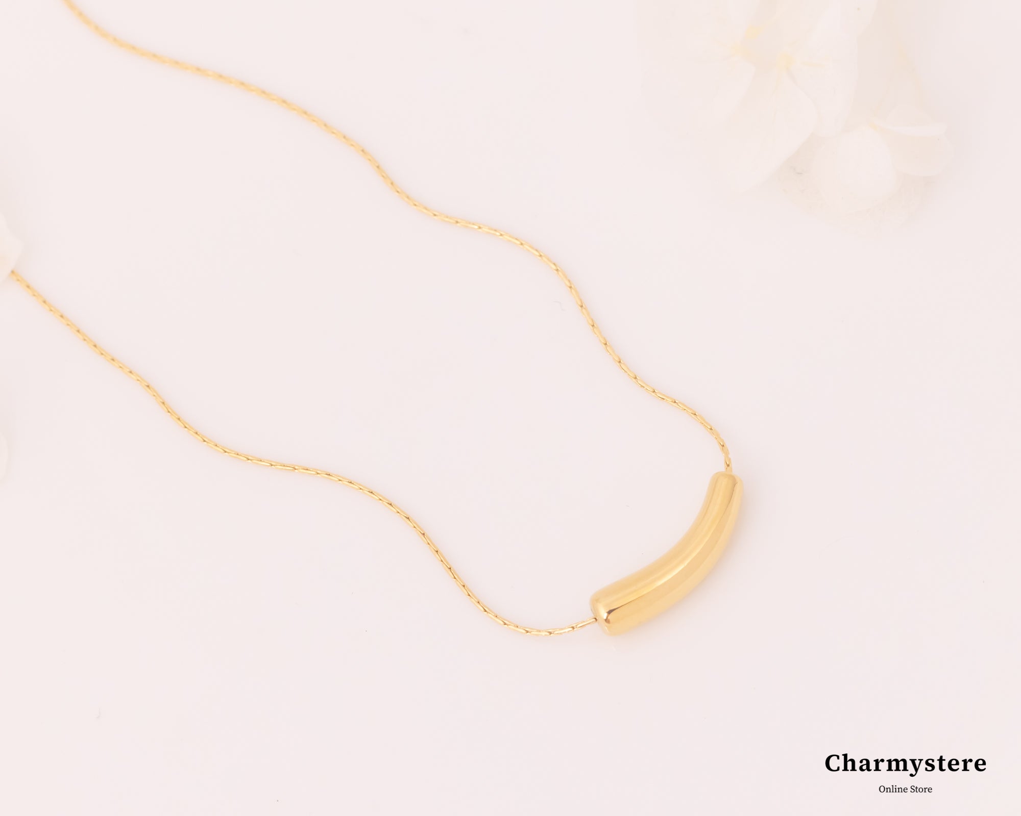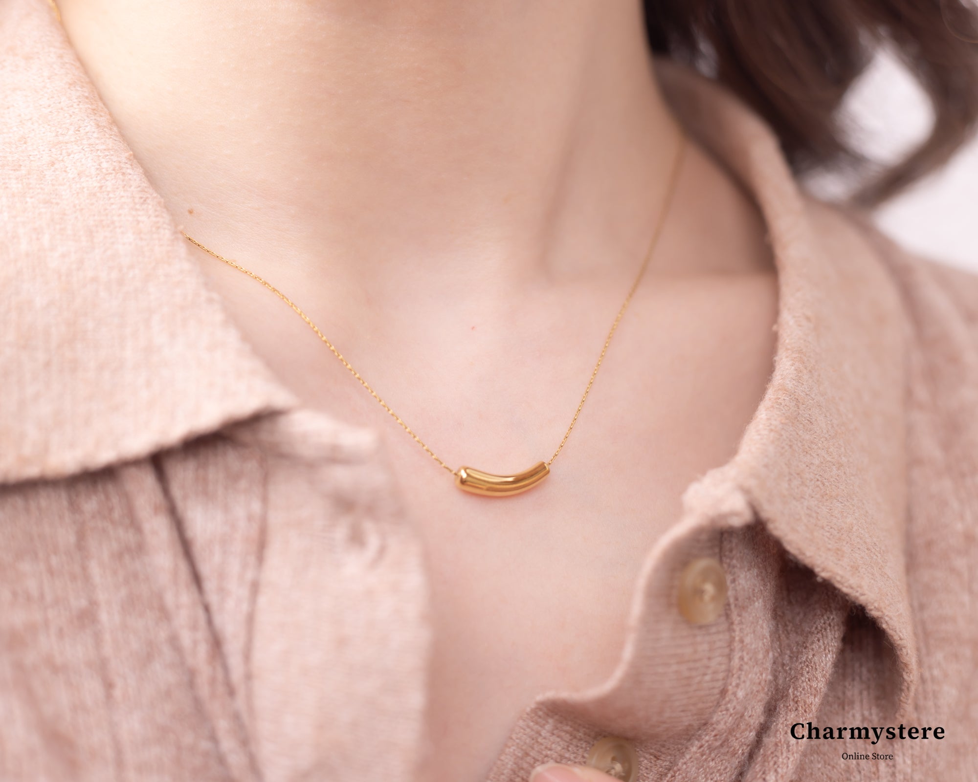 華奢なチェーンでつけているのを忘れてしまうほどの着け心地の良さとポイントとなるカーブがかったモチーフがコーデのアクセントに。