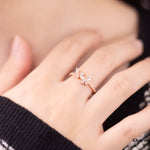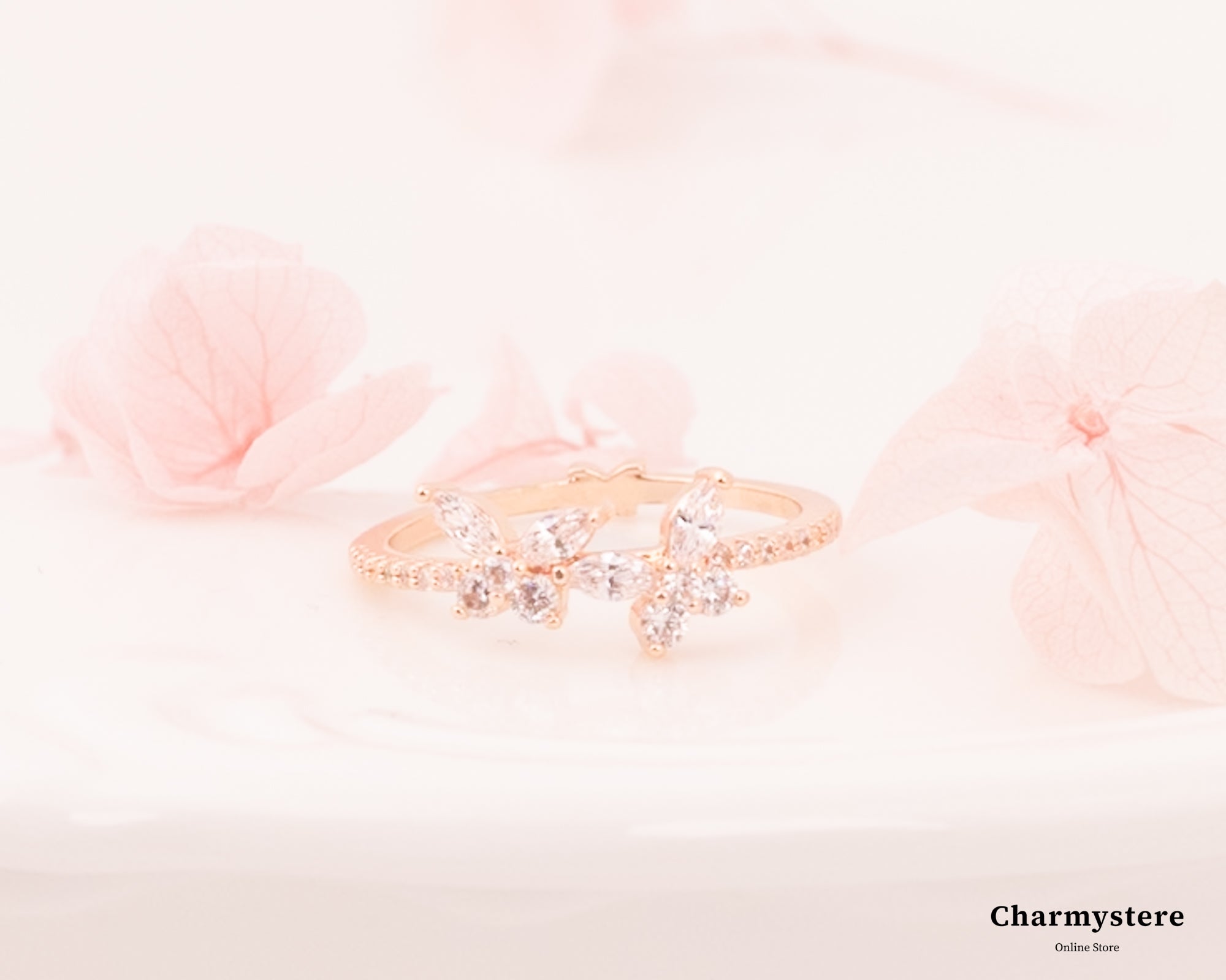 バタフライが手先ととまったようなエレガントでロマンチックで甘いデザイン。小粒なストーンがリングに敷き詰められ高見えなアイテム。