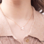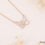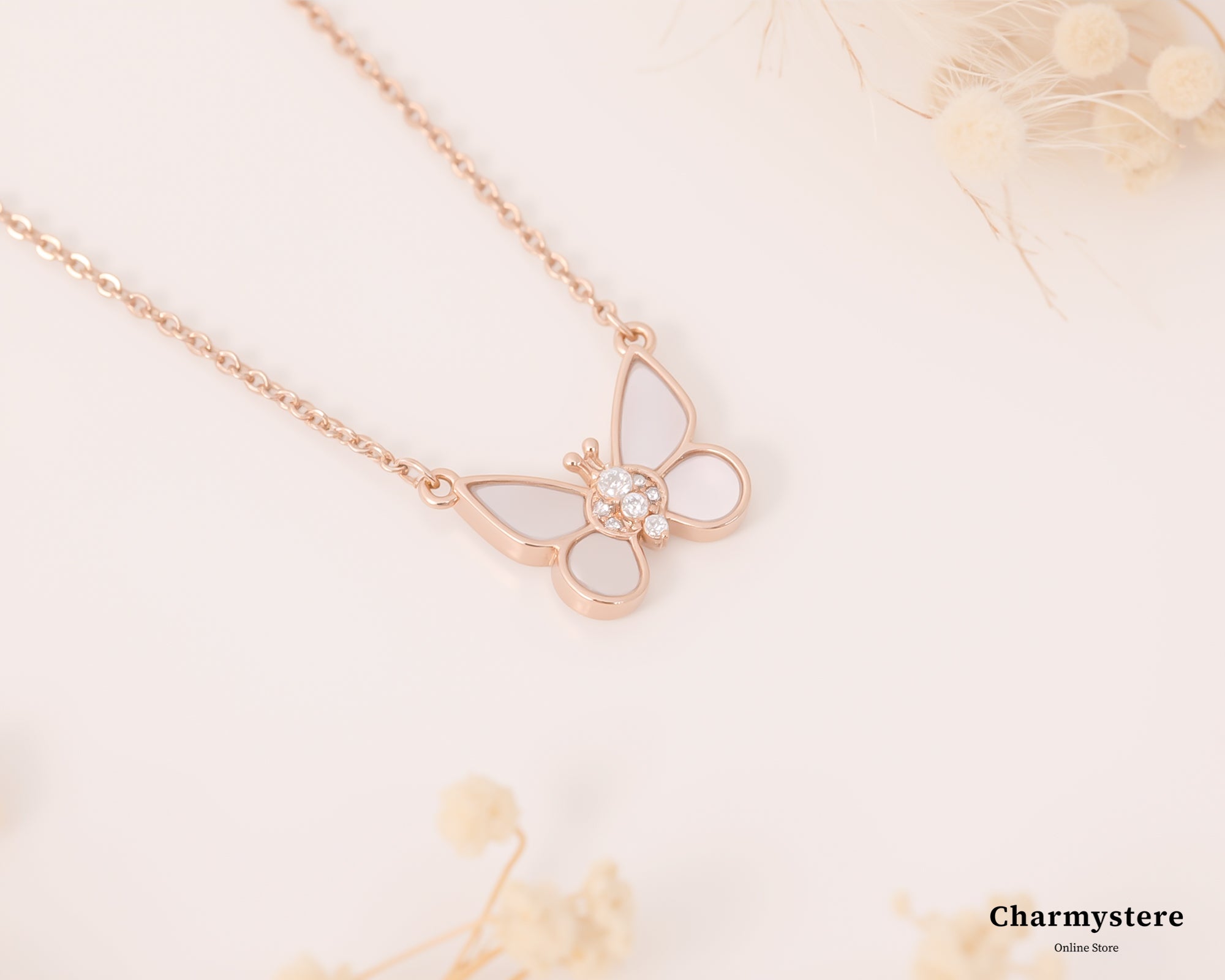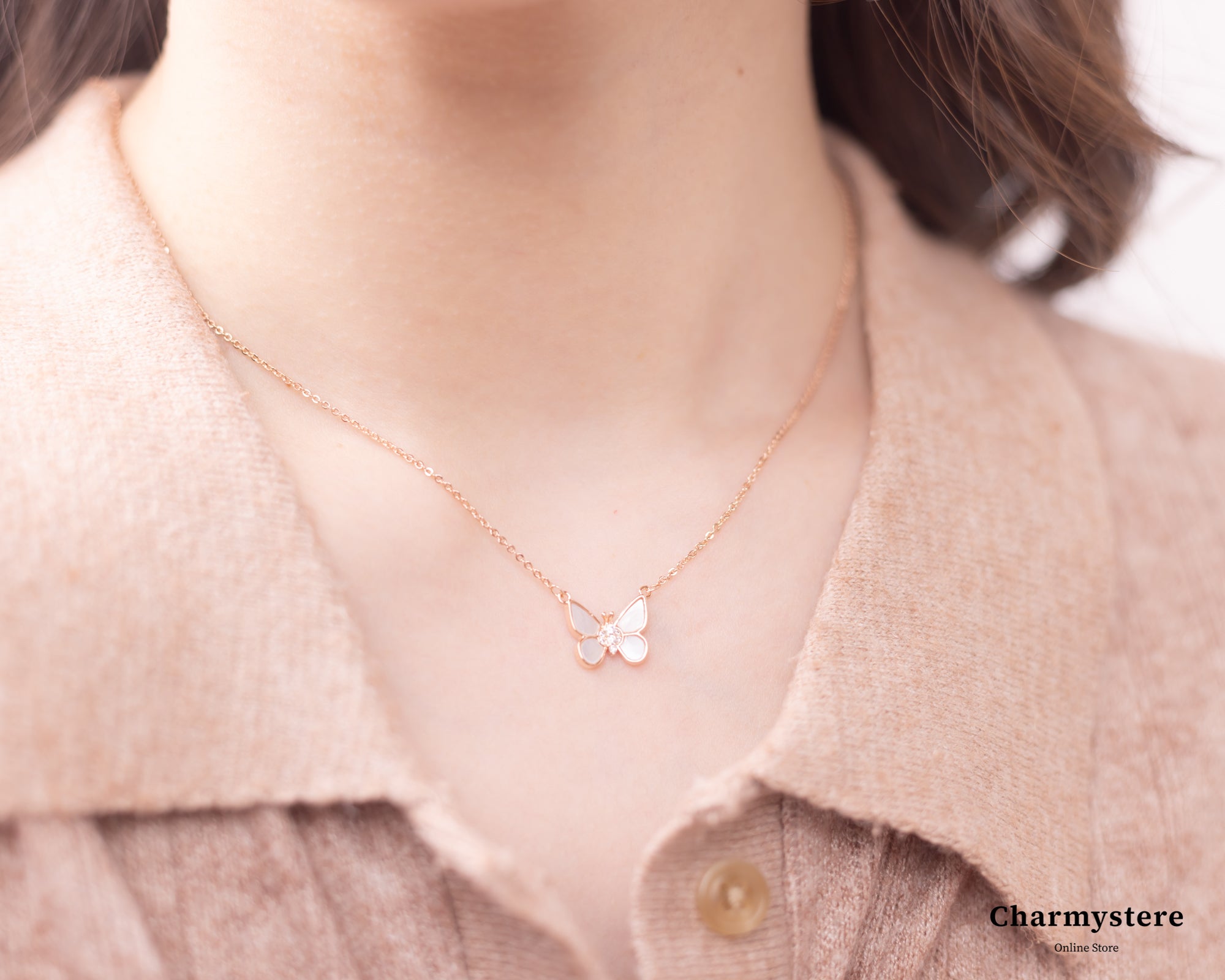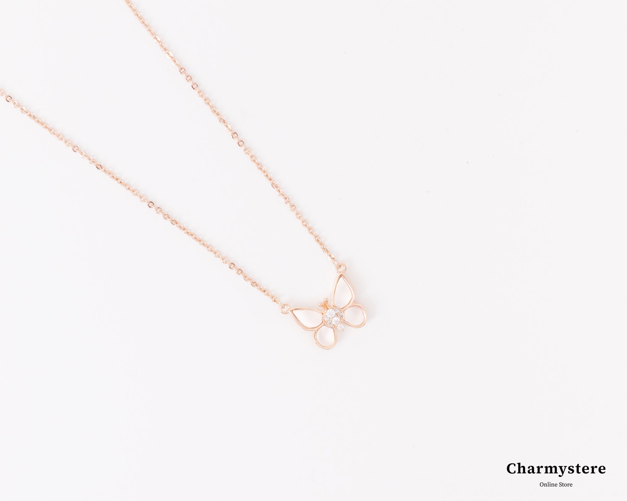 存在感あるバタフライモチーフがデコルテのワンポイントに煌めき、シェルの上品な艶やかさが加わり更に女性らしさをプラス。
