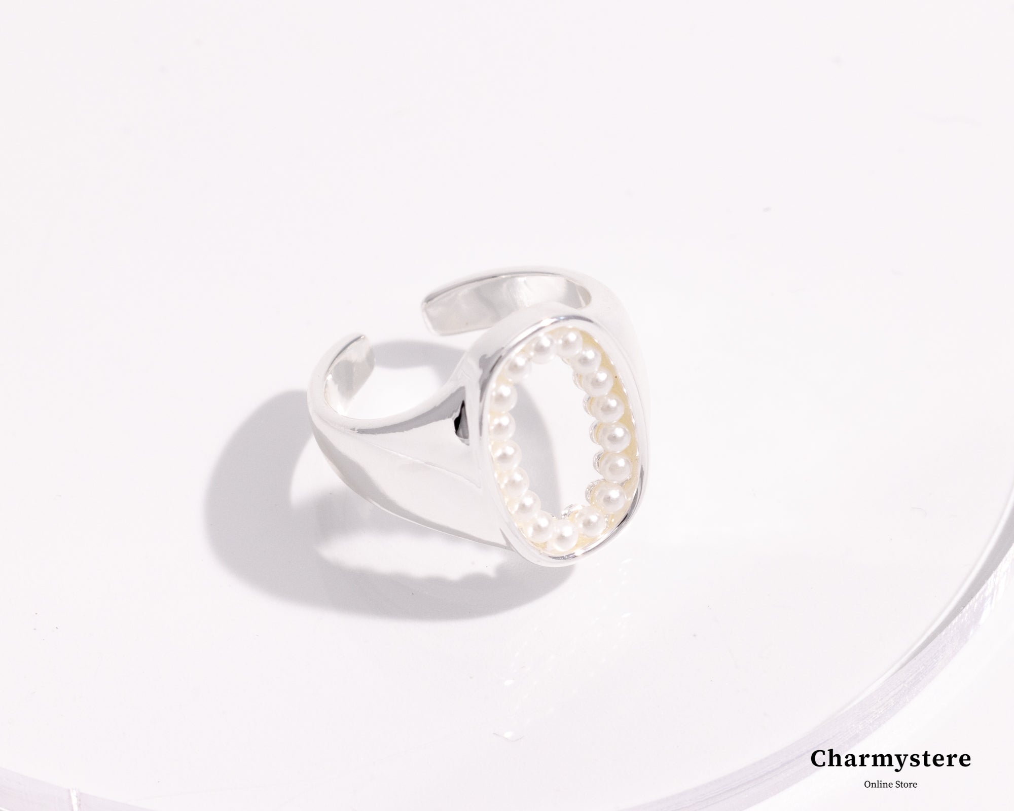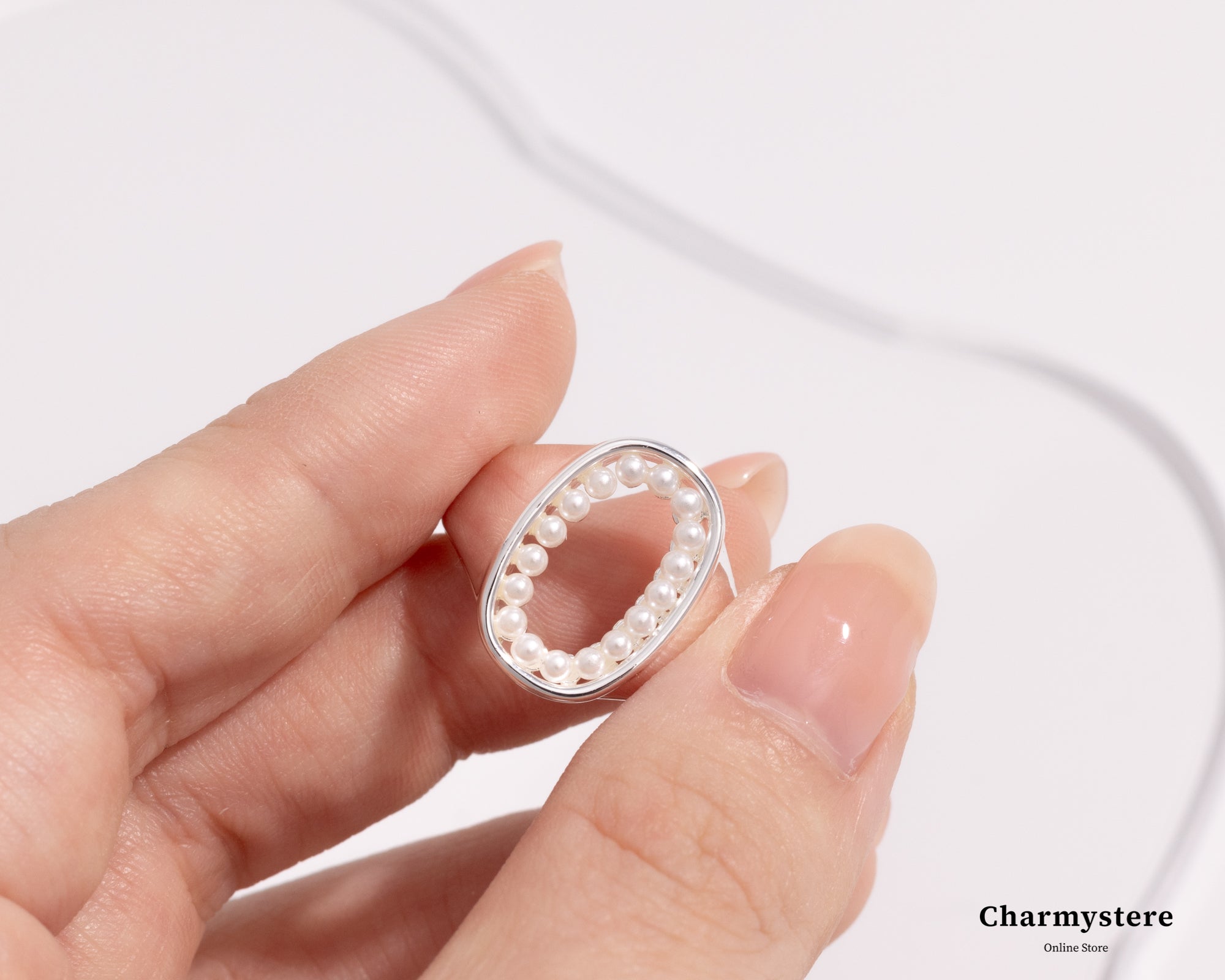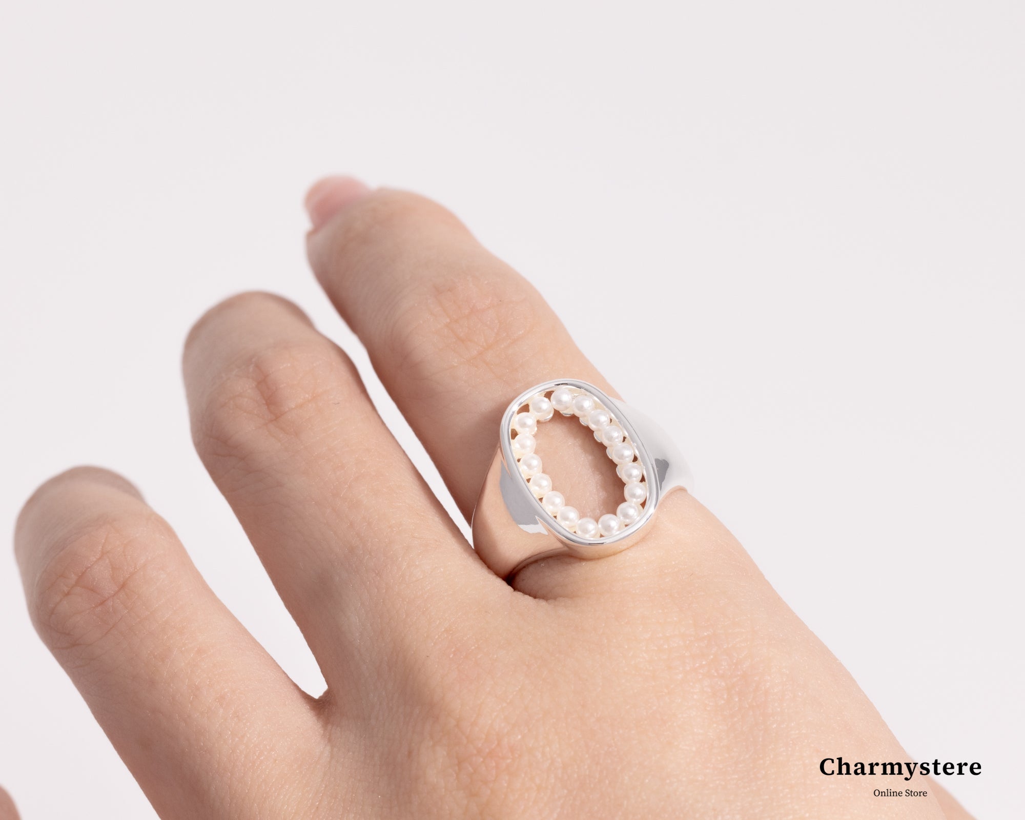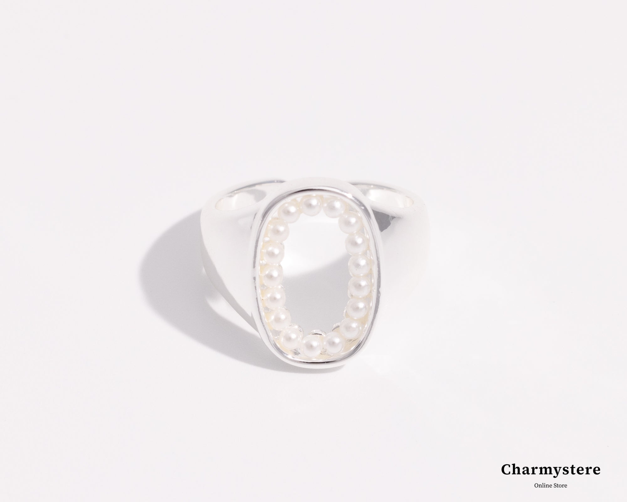 スタイリッシュなオーバルリングにパールが敷き詰められた個性的なリング。