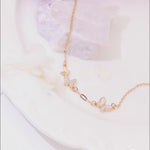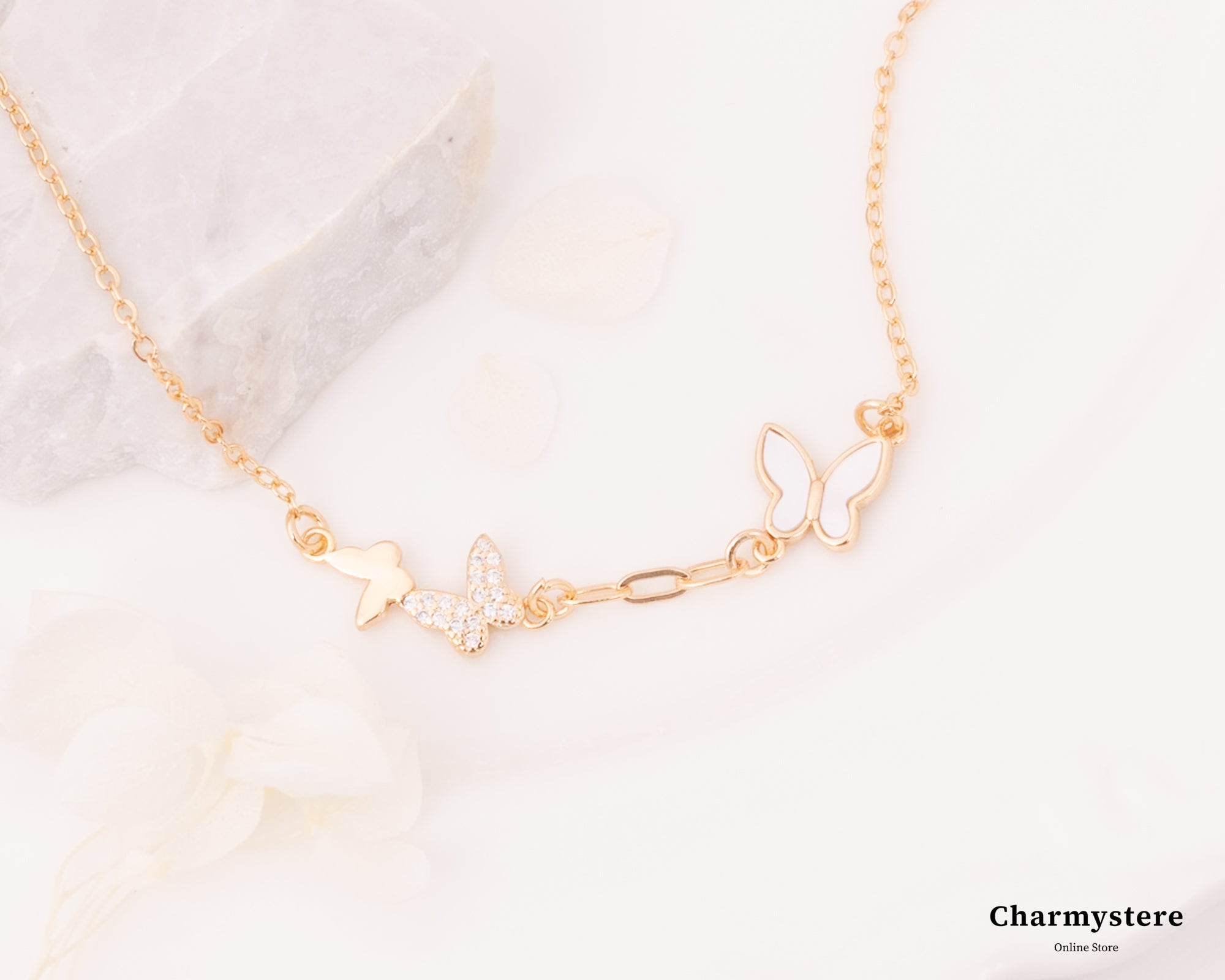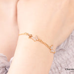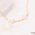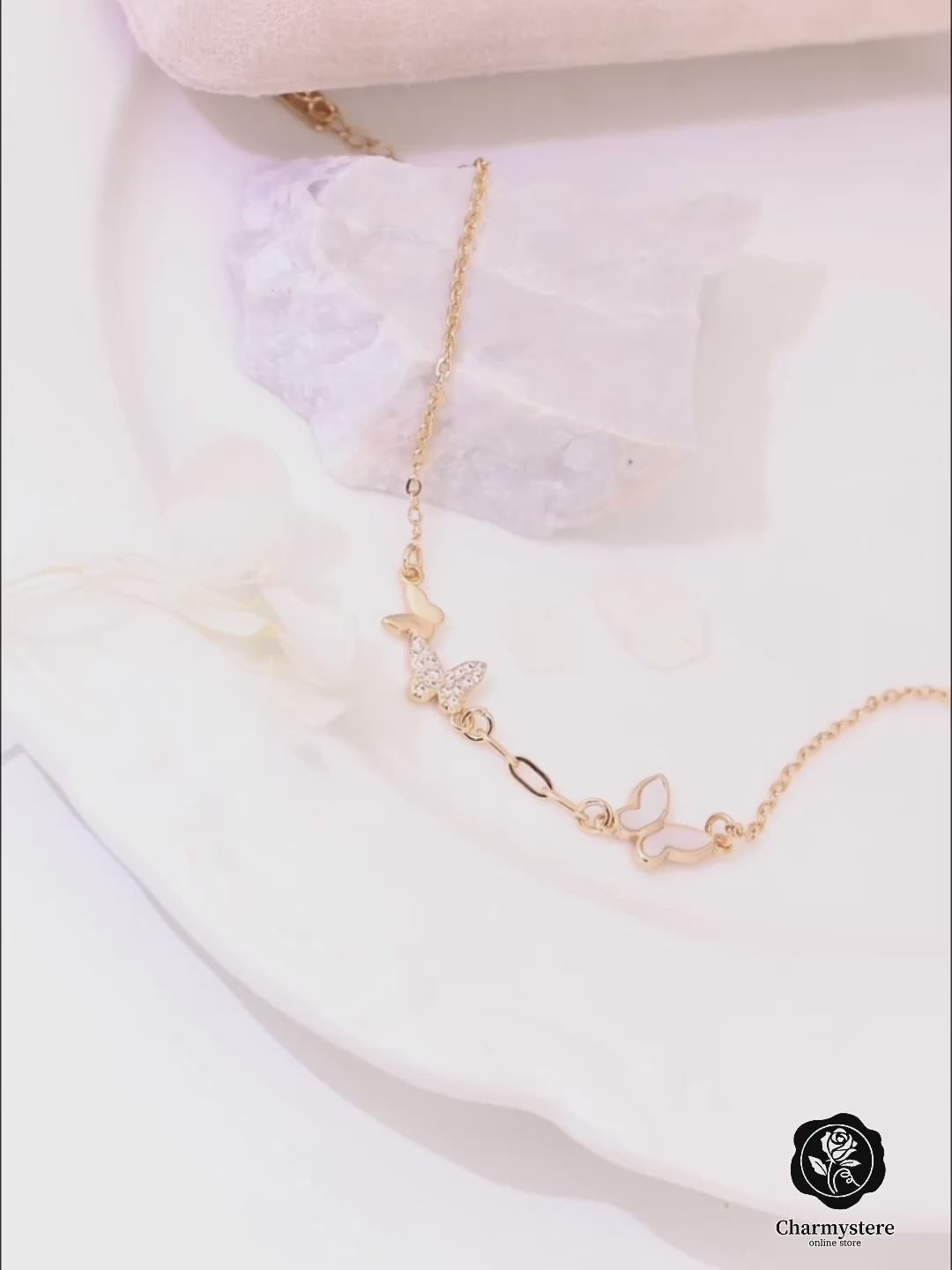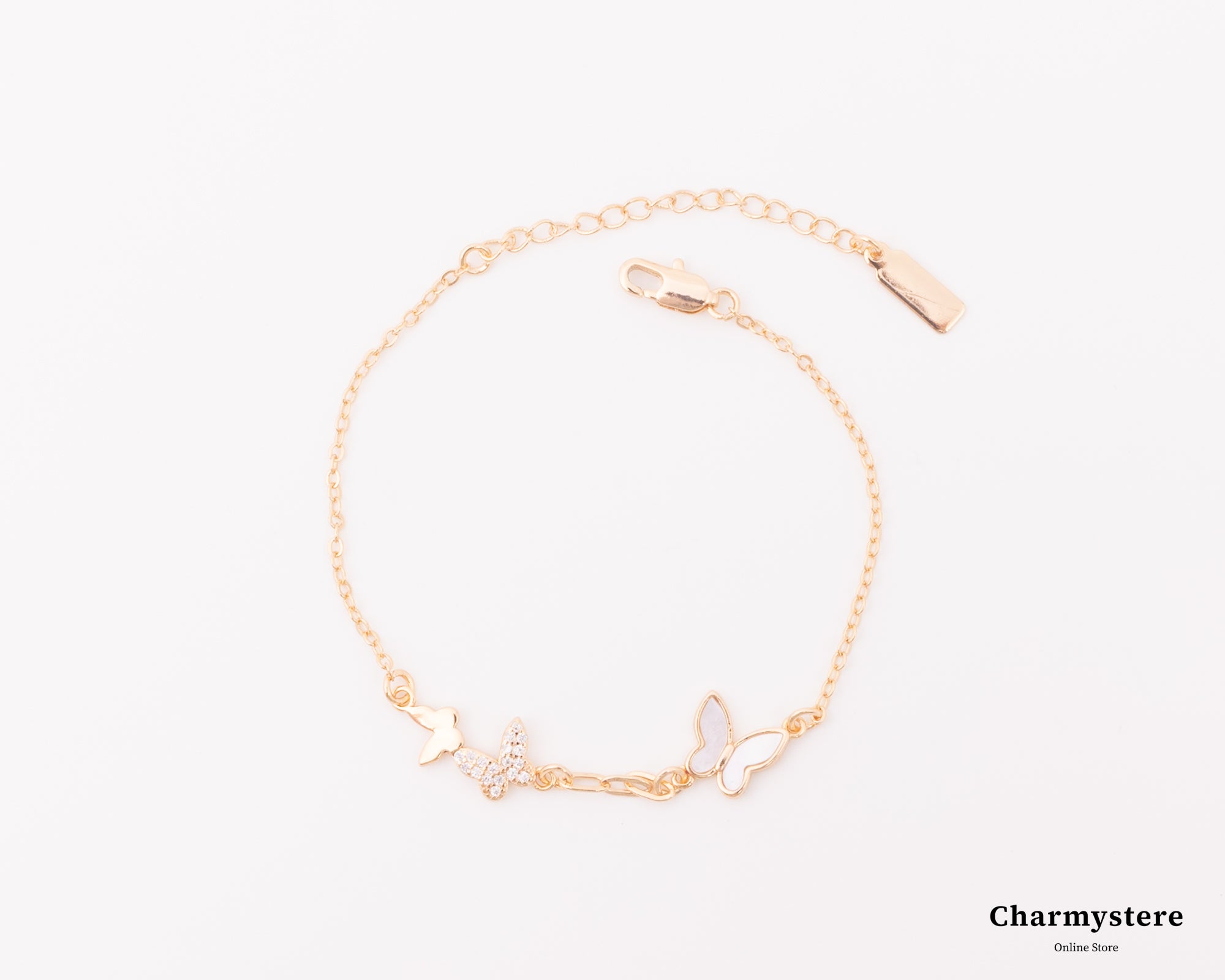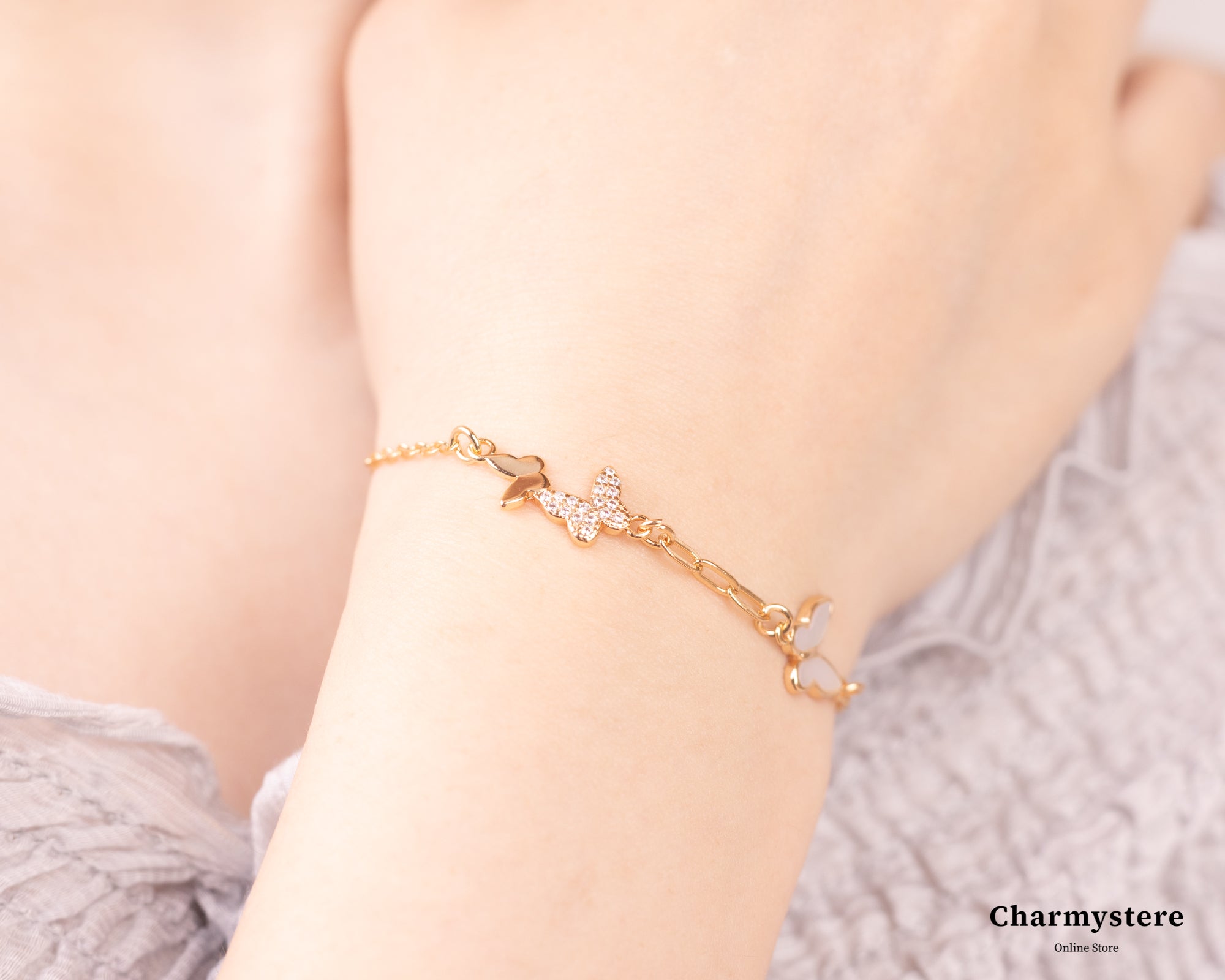 バタフライモチーフのカジュアルなチェーンとの組み合わせで甘辛を調和した華やかなブレスレット。手元に一つあるだけで存在感もあり、おしゃれのポイントに。