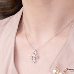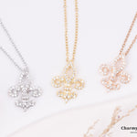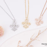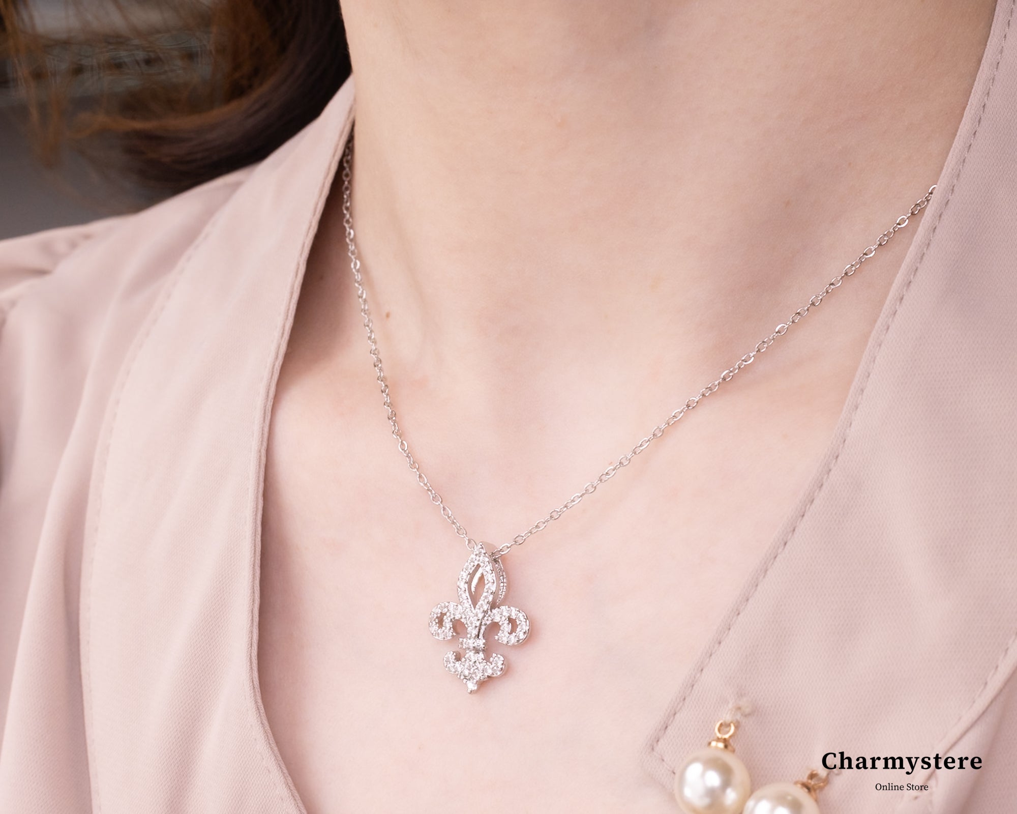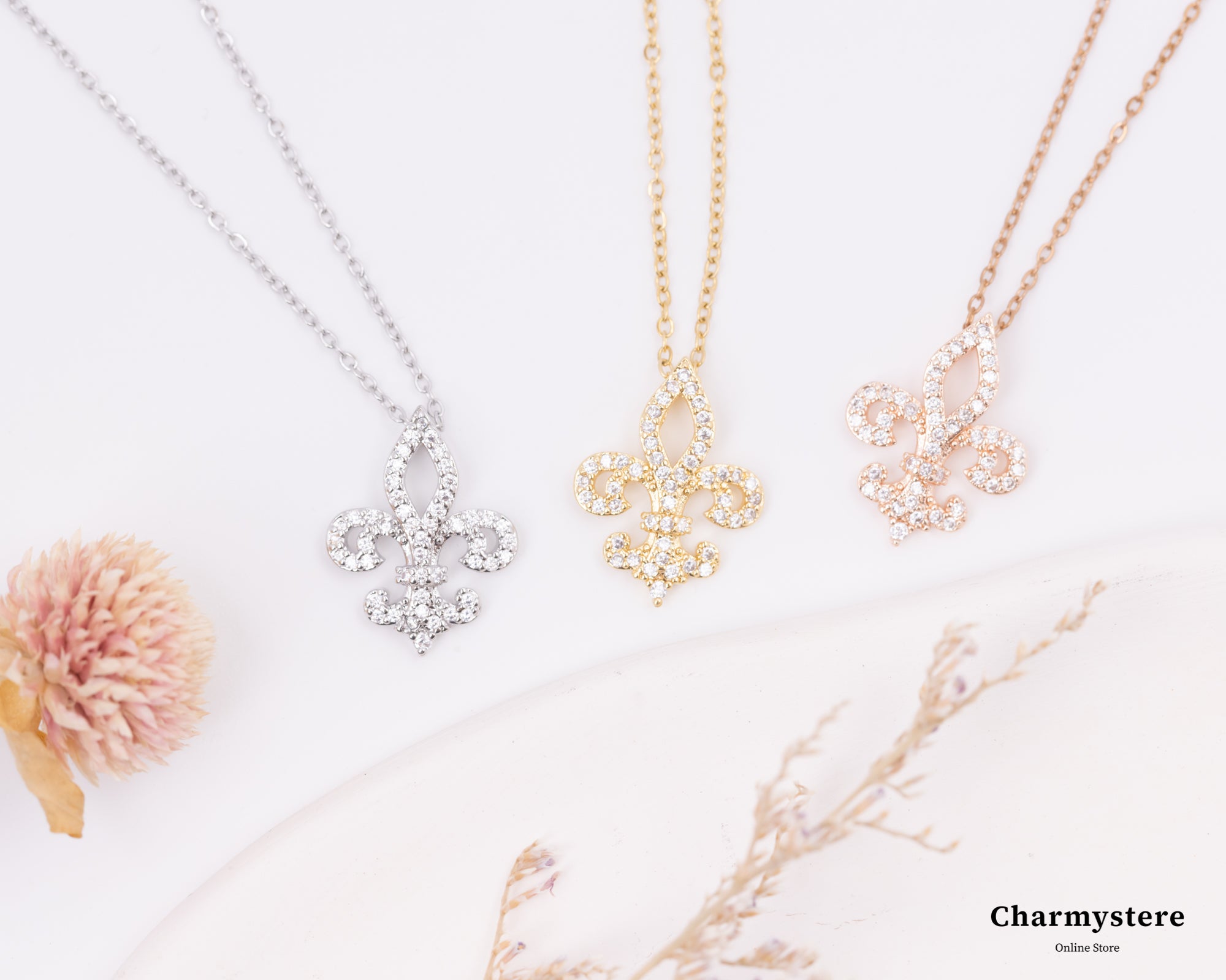 高貴なシンボルであるフルール・ド・リス(ユリの紋章)のモチーフを使い、クラシックなエレガンスをプラス。ストーンが贅沢にあしらわれています。ゴールド、シルバー、ピンクの3色展開で、日常から特別なシーンまで幅広くお使いいただけます。同じデザインのピアスと一緒に着けるとコーデの統一感が出て、1段階上のおしゃれをお楽しみいただけます。