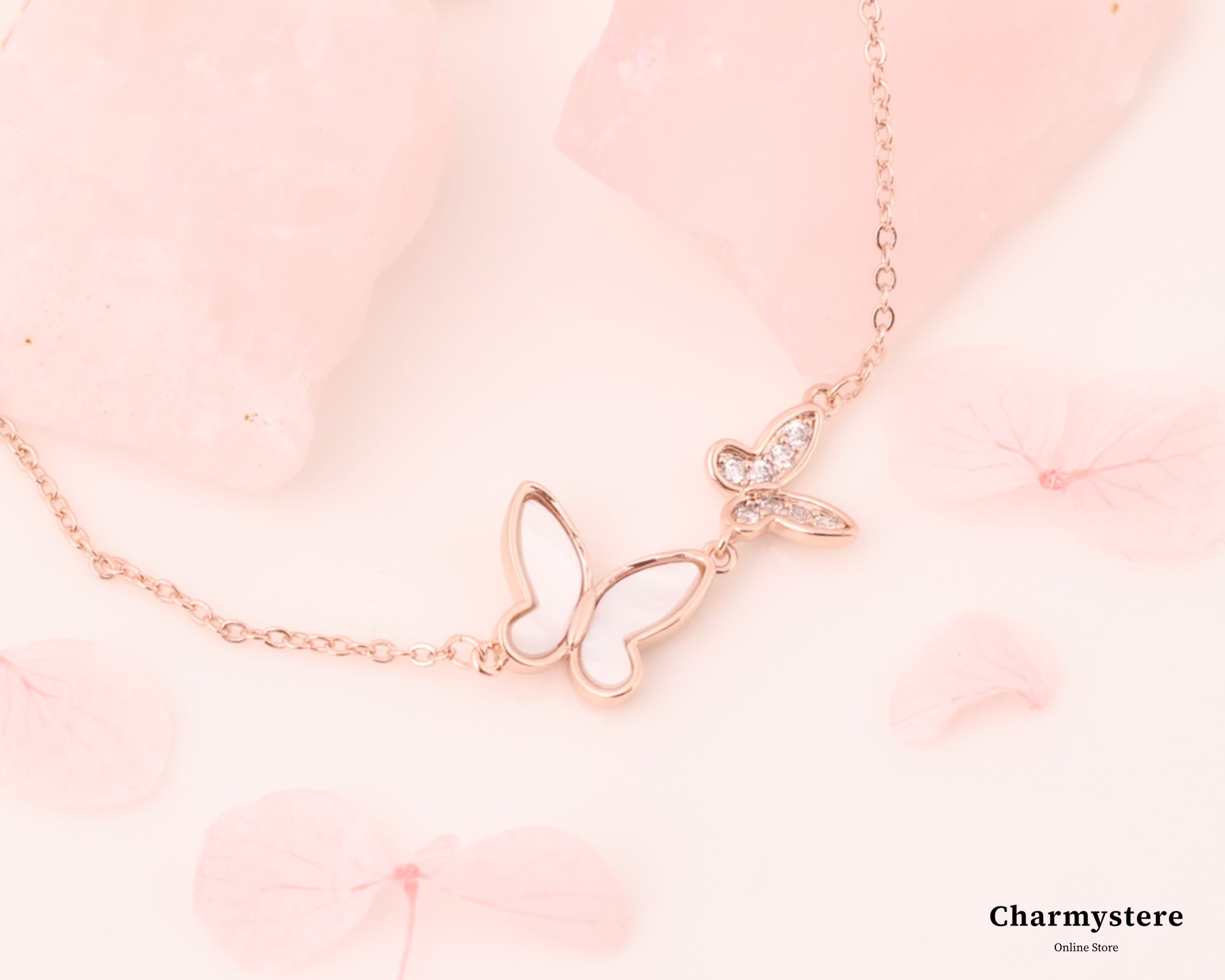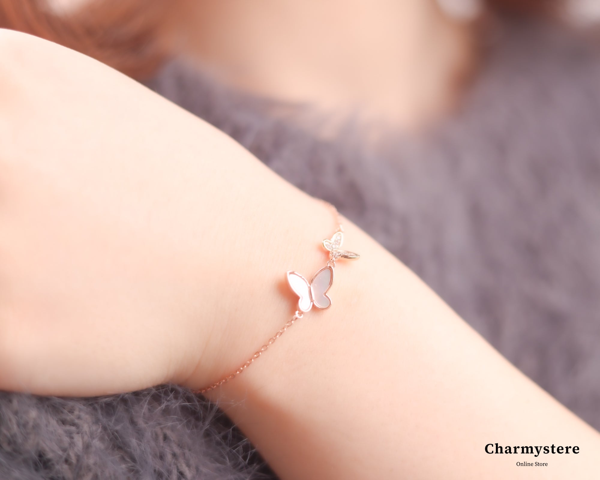 バタフライのデザインとハートのストーンが組み合わさったフェミニンで大人可愛いブレスレット。手元を一気に華やかに見せてくれ、コーデのワンポイントに。