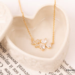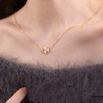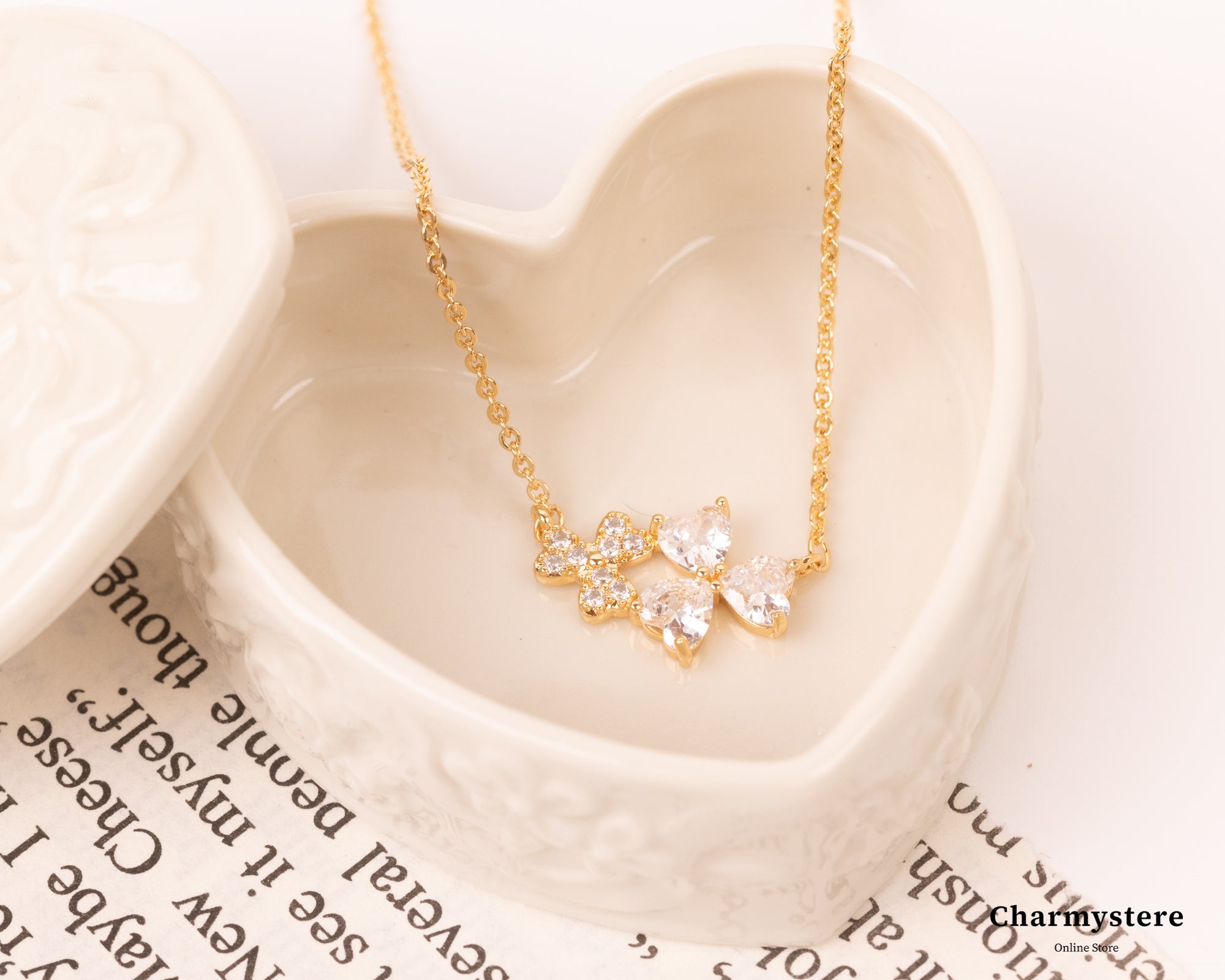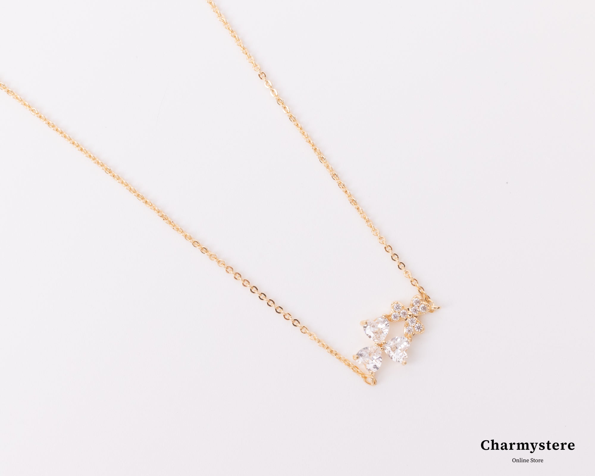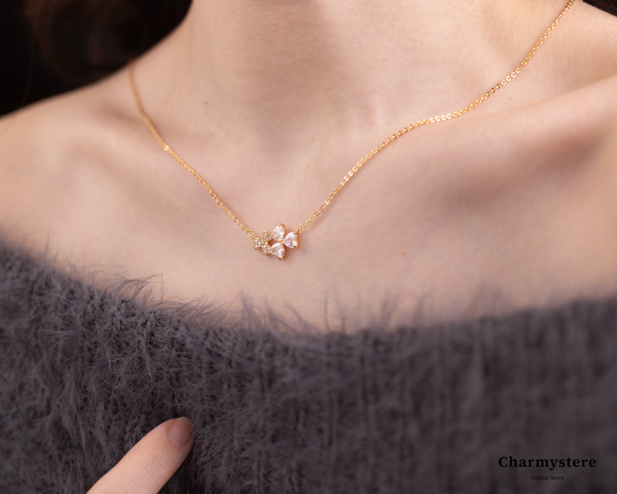 三つ葉のハート形クローバーのネックレス。小粒で繊細なデザインは高見えなアイテムに◎