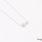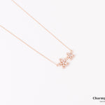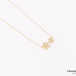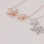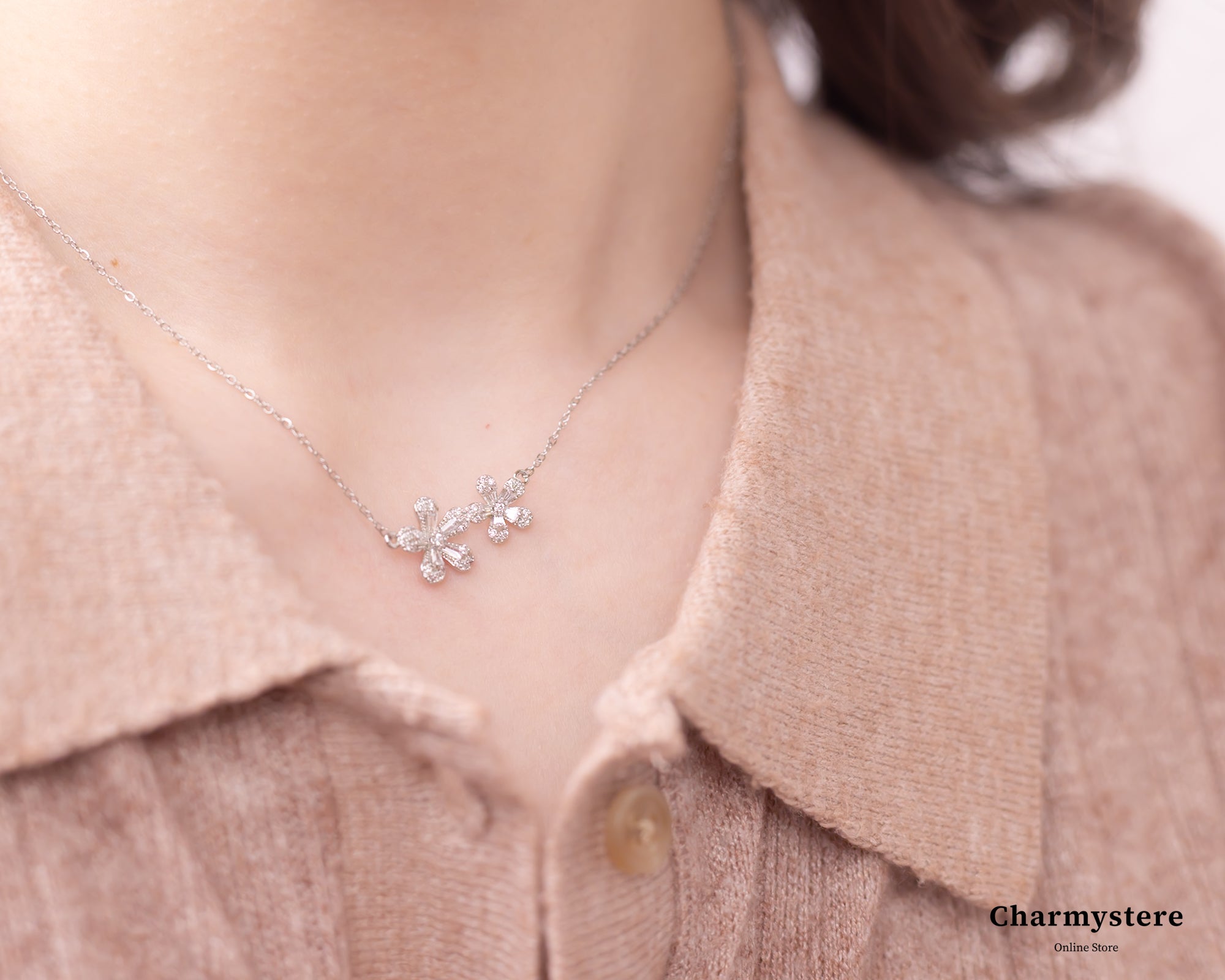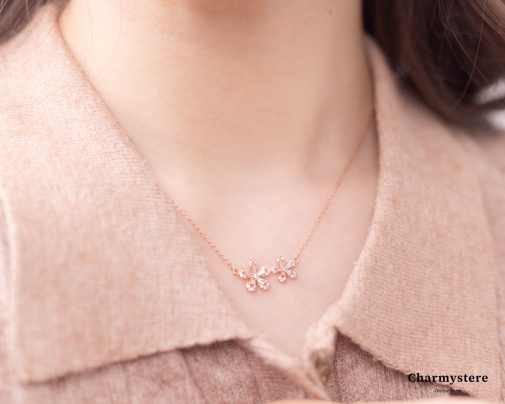 煌びやかなフラワーモチーフが大小で2つ並んだデコルテを流れるようなスタイリッシュで上品なネックレス。