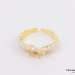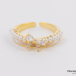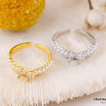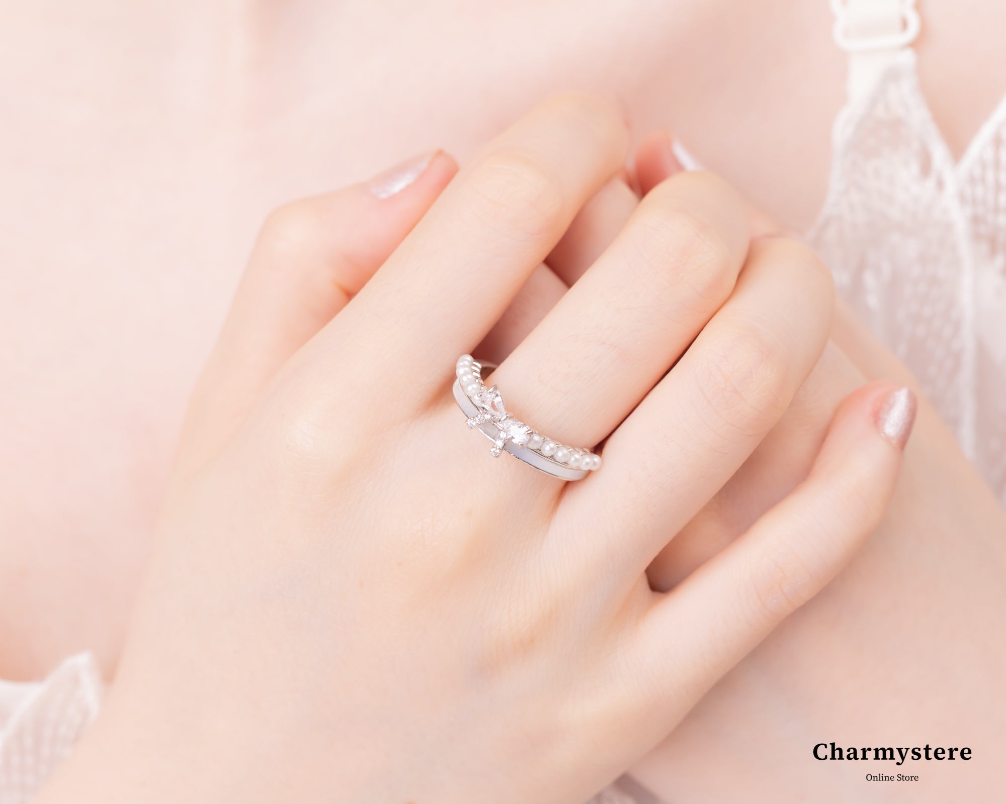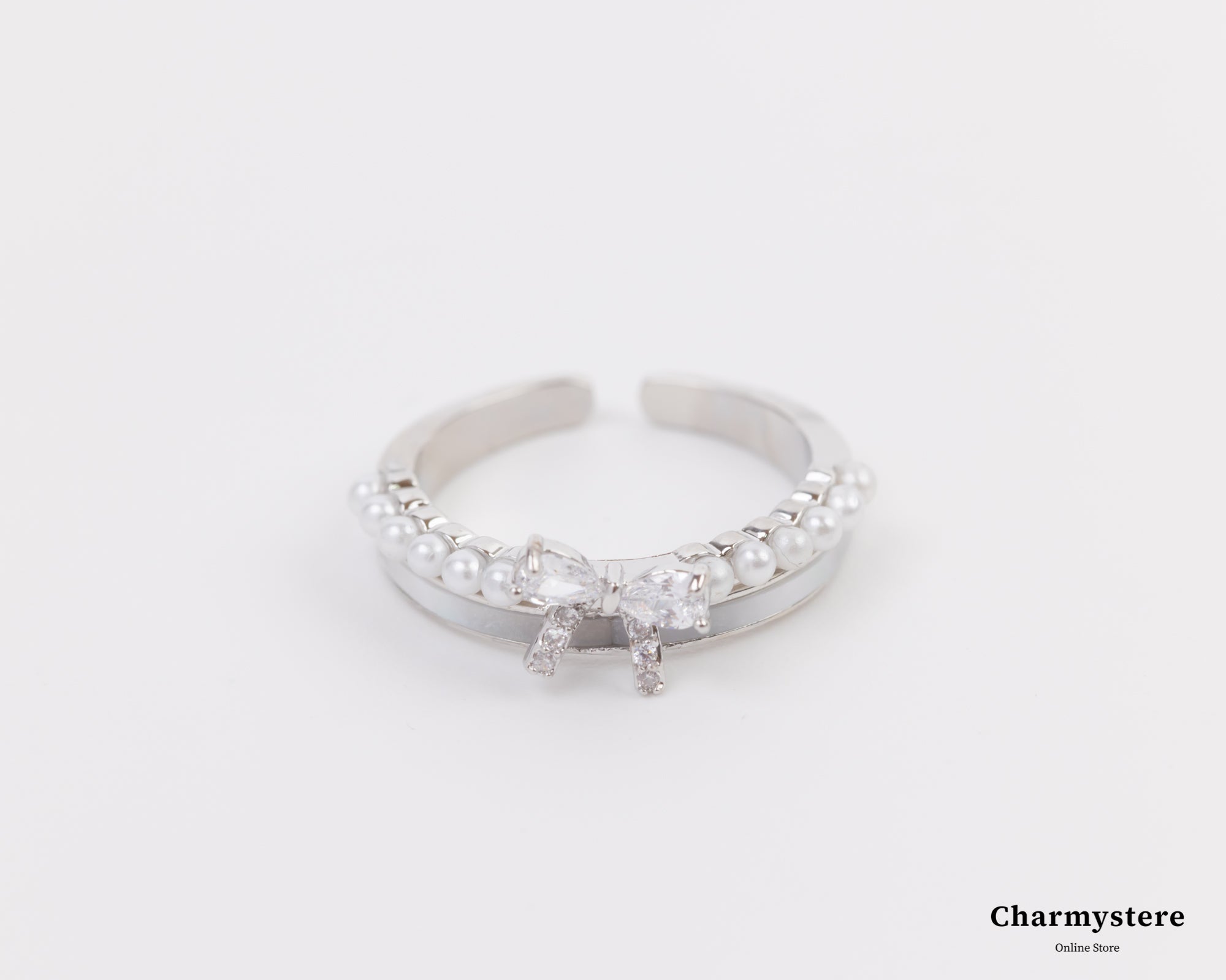 ゴールドとシルバーの2色展開で、パールとストーンをあしらったリボンモチーフが特徴です。調節可能なデザインで、どんな指にもフィットしやすく、デイリー使いから特別なシーンまで幅広くお楽しみいただけます。