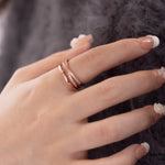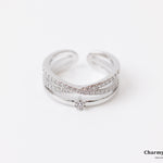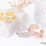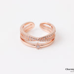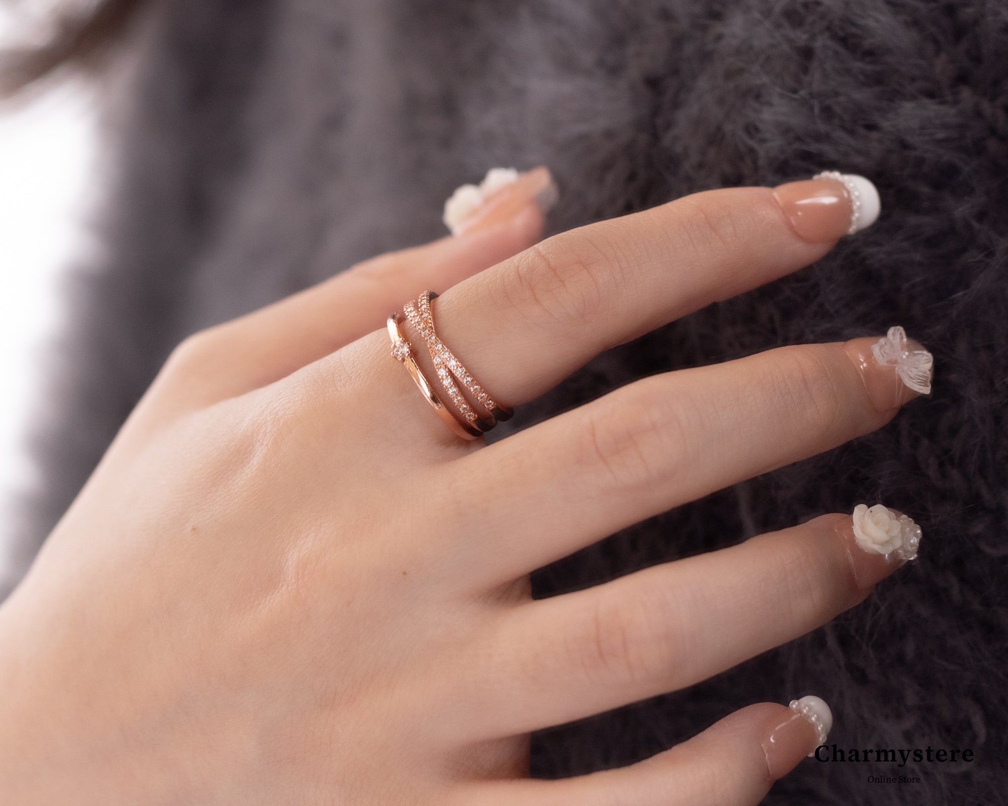 クロスラインの入った小粒なストーンが敷き詰められたビジューなラインと、ワンポイントの小振りなストーンが施された直線のラインが一緒になったレイヤード感のあるリング。