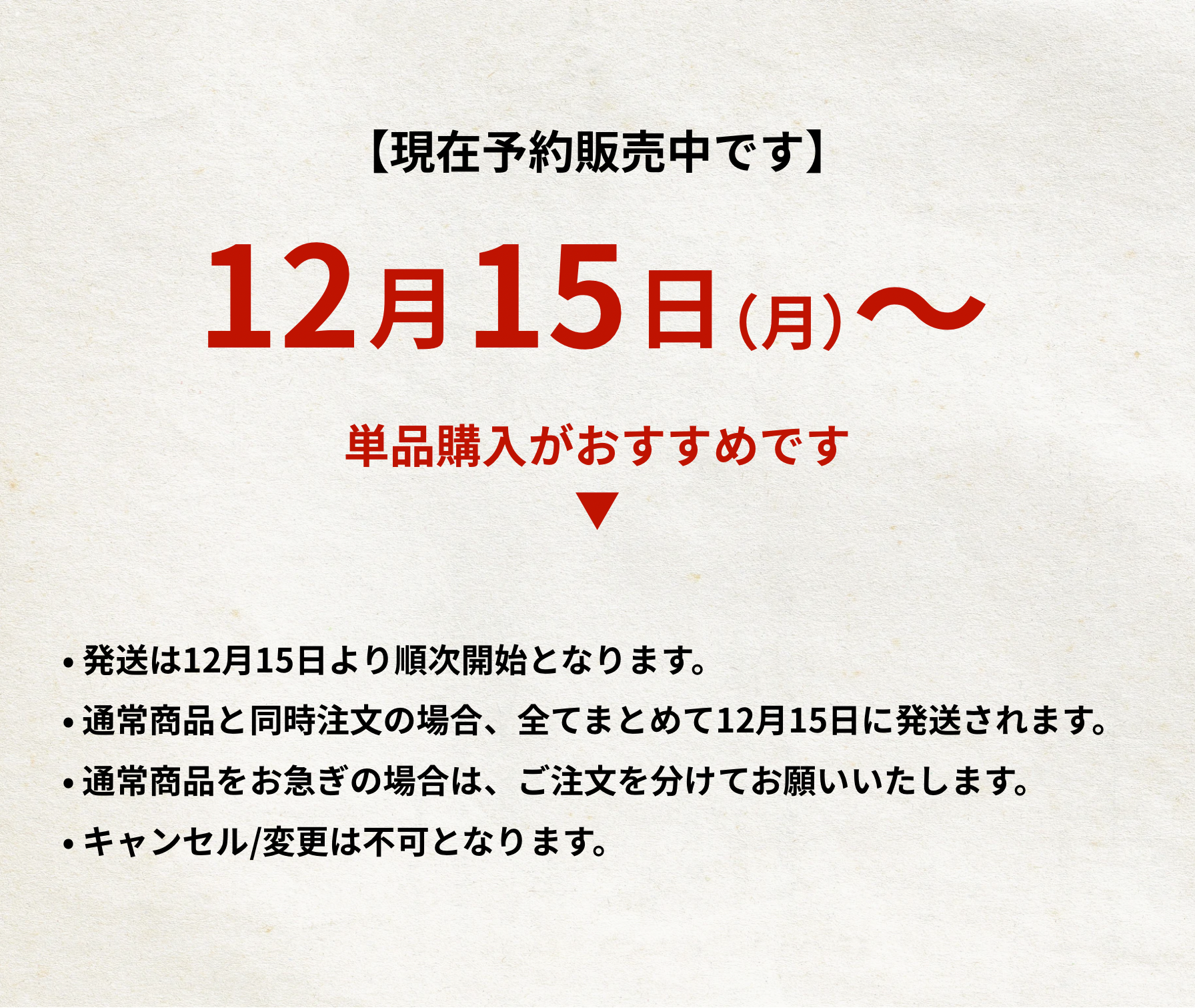 発送予定日: ご注文後、12月15日(月)より順次発送を開始いたします。
