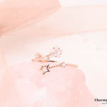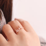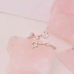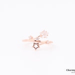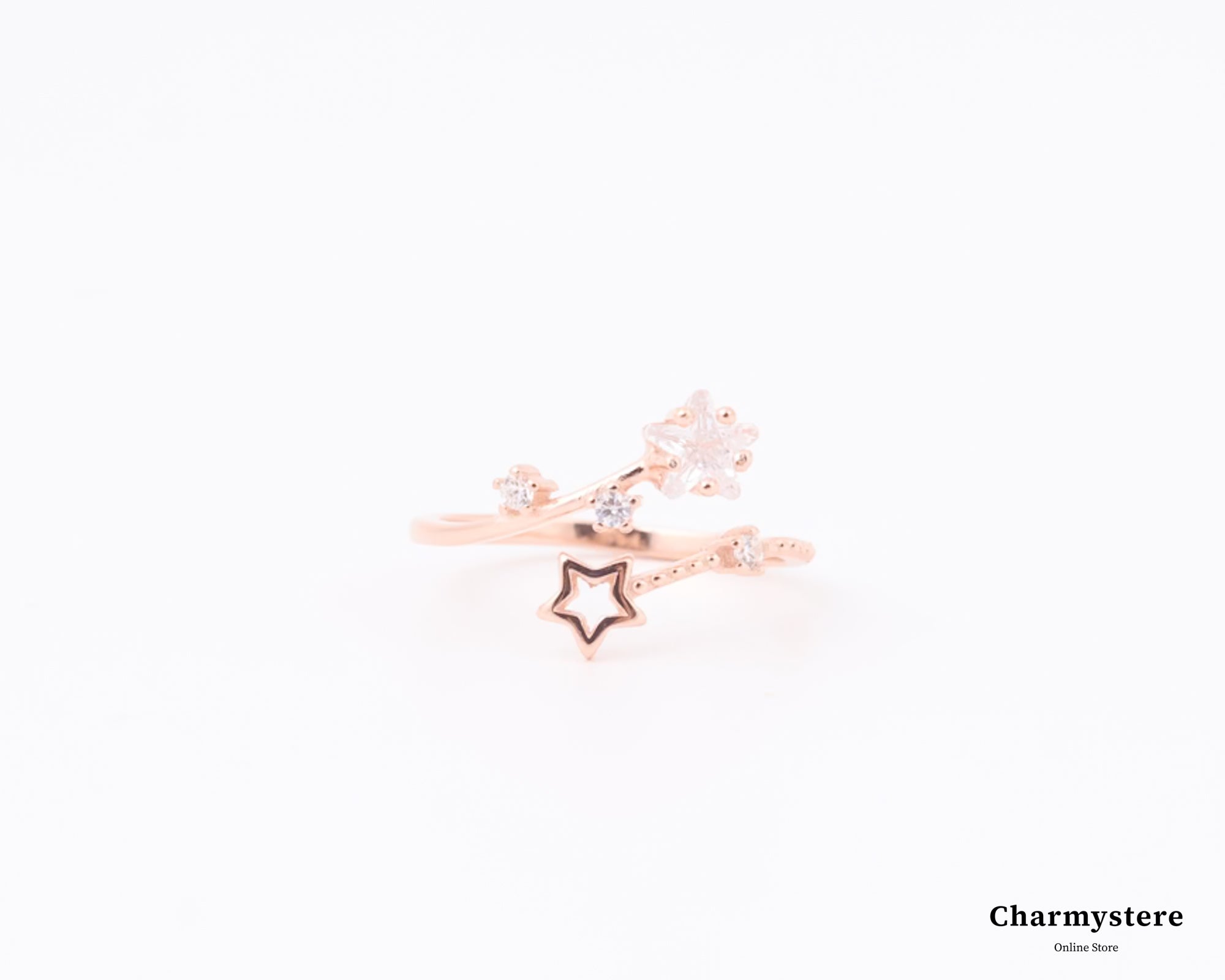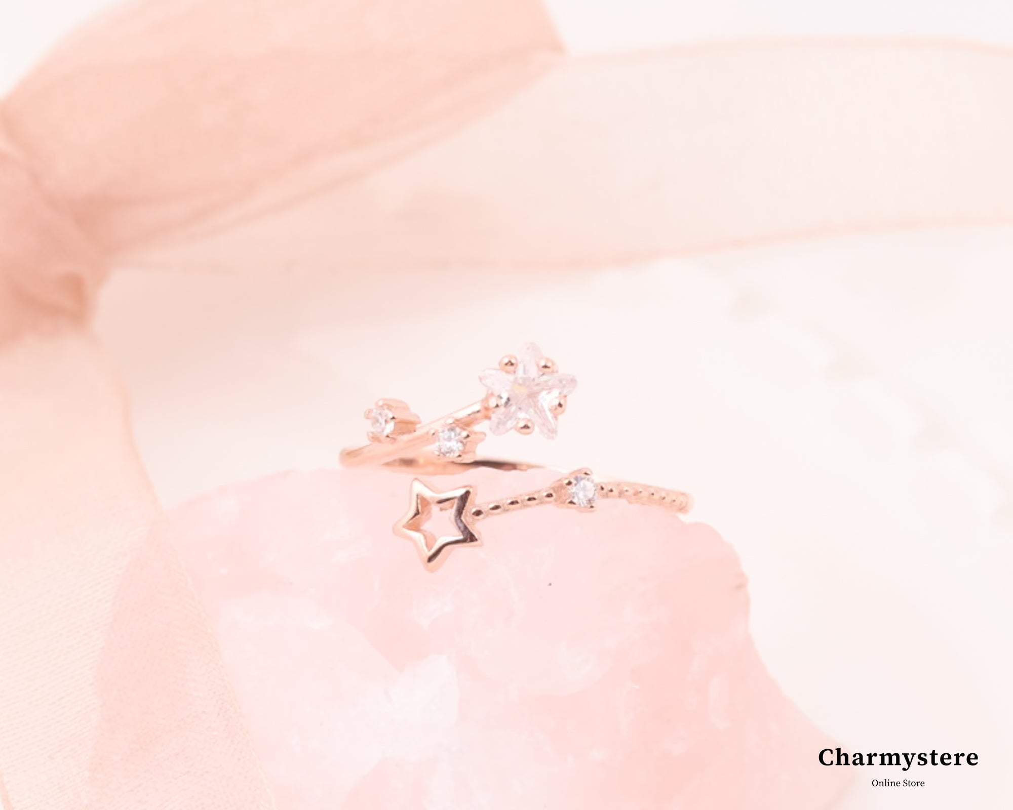 silver925の高品質なリング。星が連なるフェミニンなモチーフで指を包み込むようにハグするフリーサイズデザインで、手元を華やかに、そして斜めラインに計算して作られた手元を華奢に見せるデザインに演出。