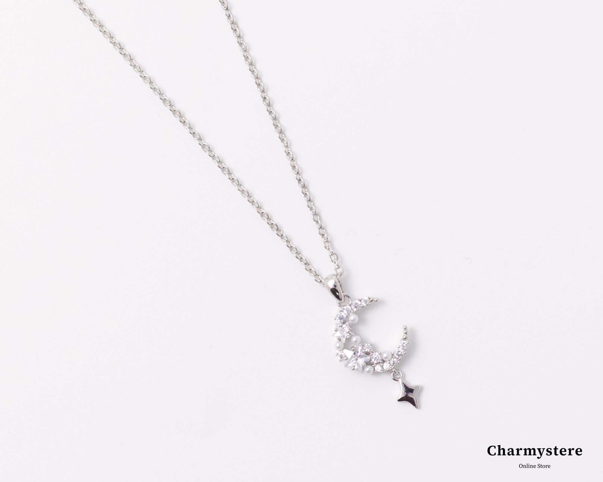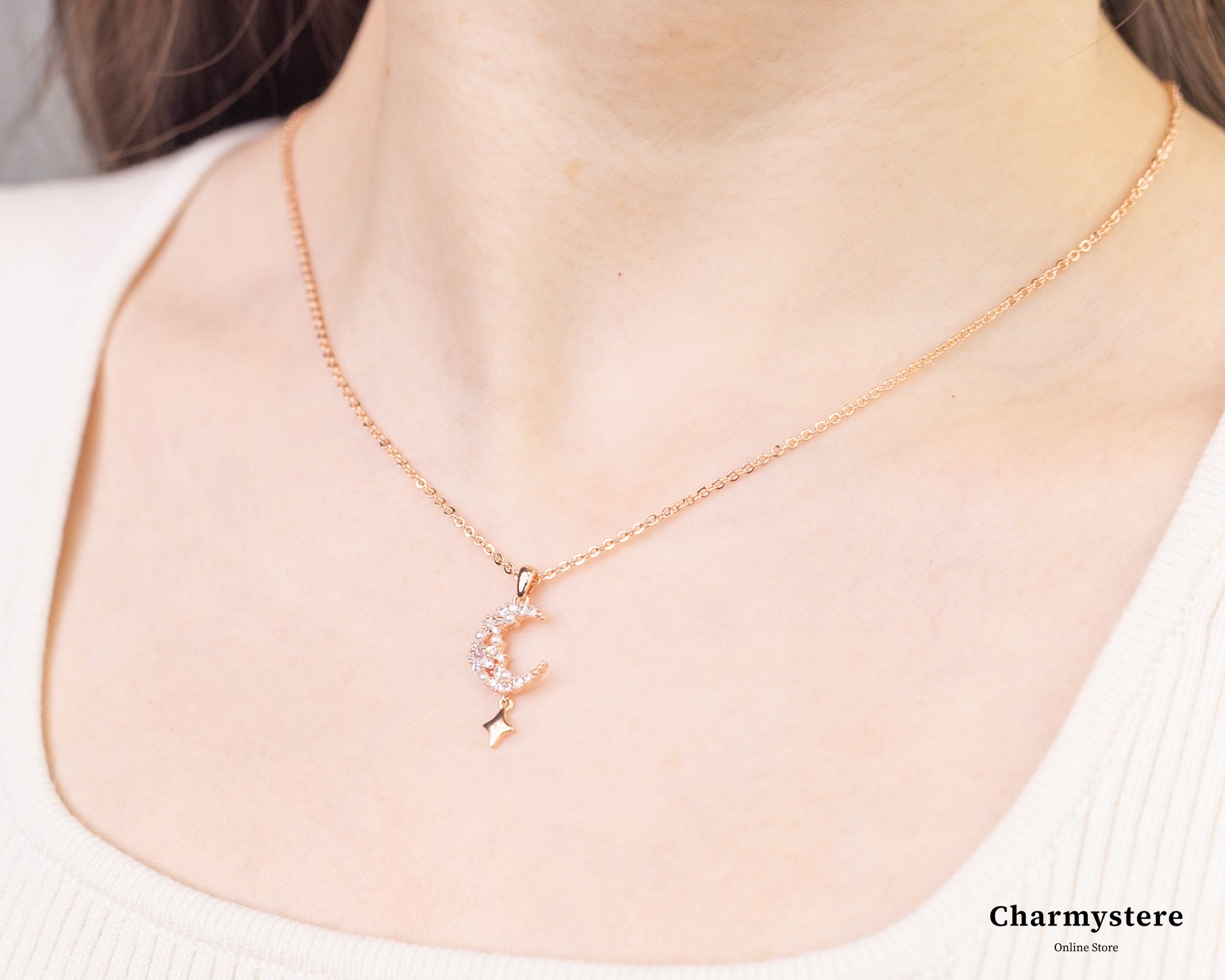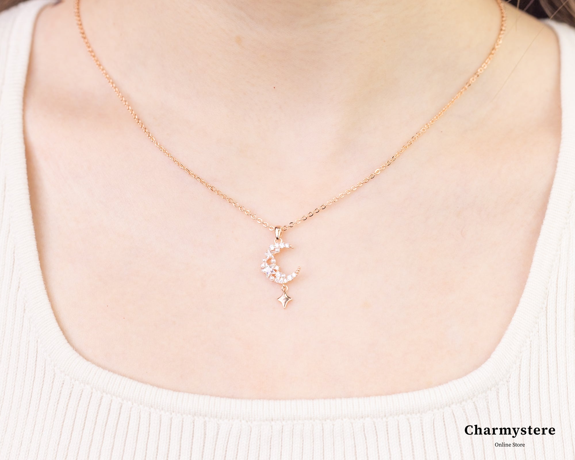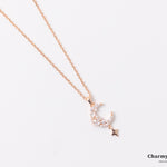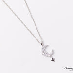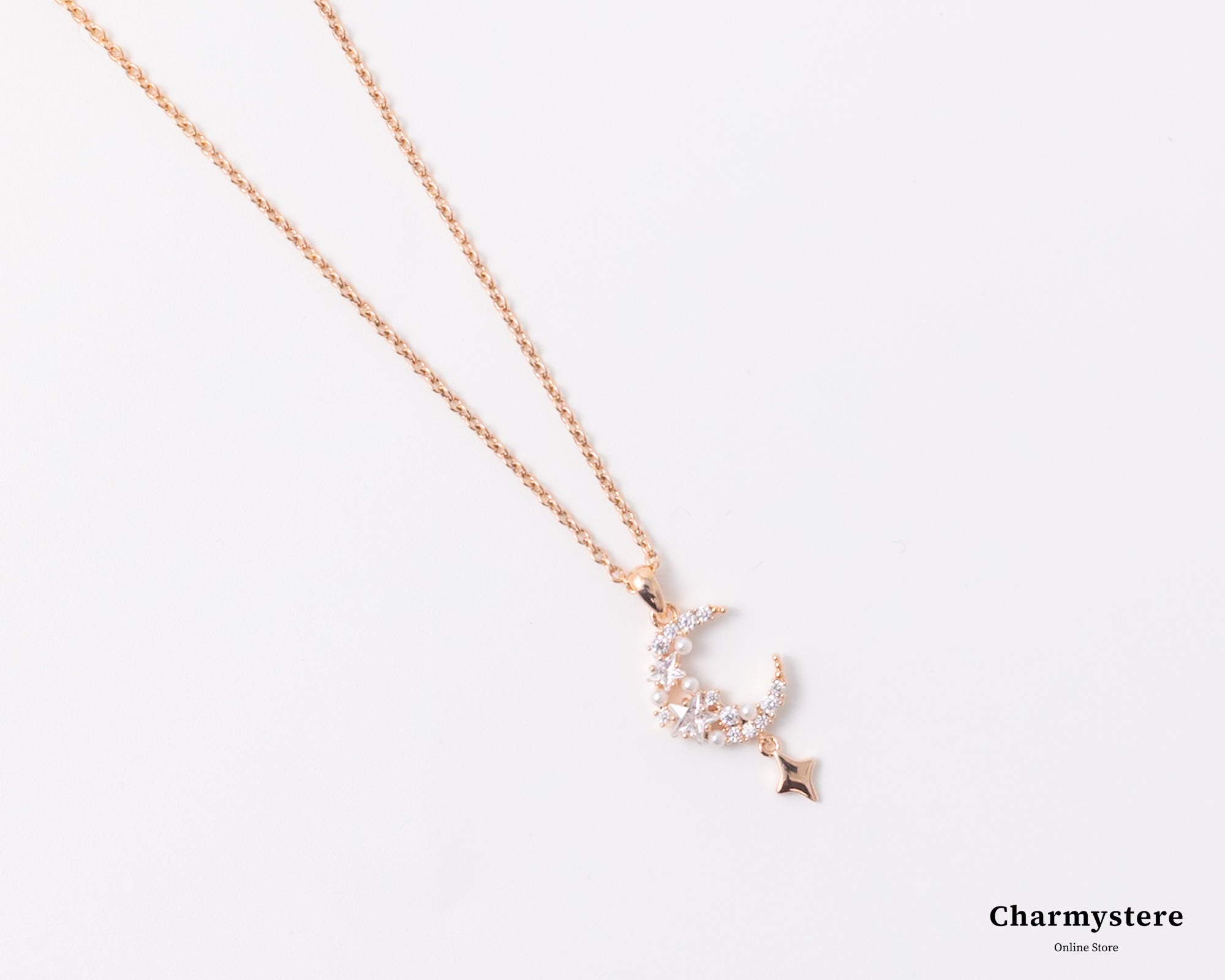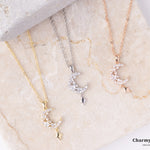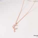 幻想的でエレガントなロマンチックなデザイン。繊細なチェーンに、美しく煌めくストーンの月と星のモチーフがあしらわれています。