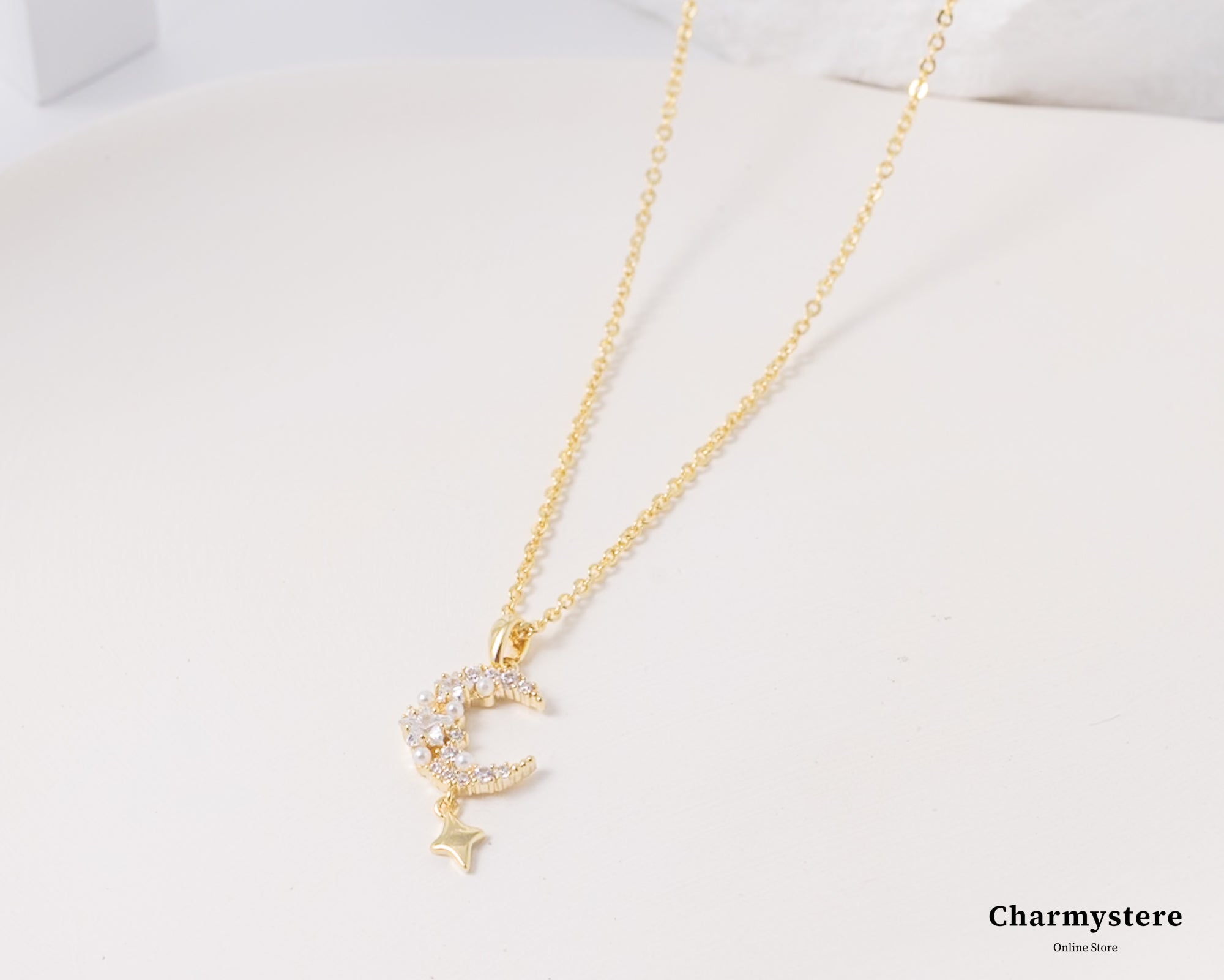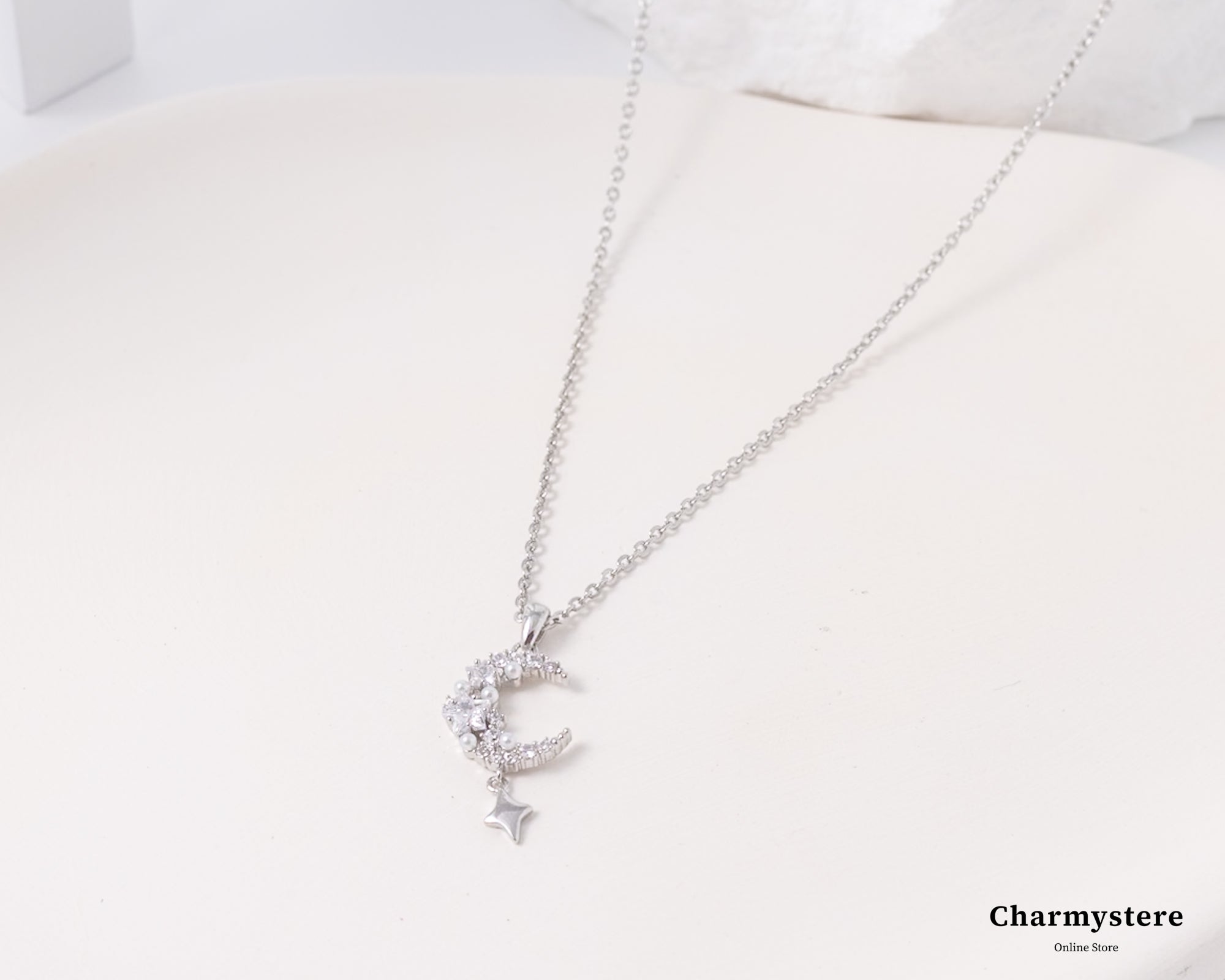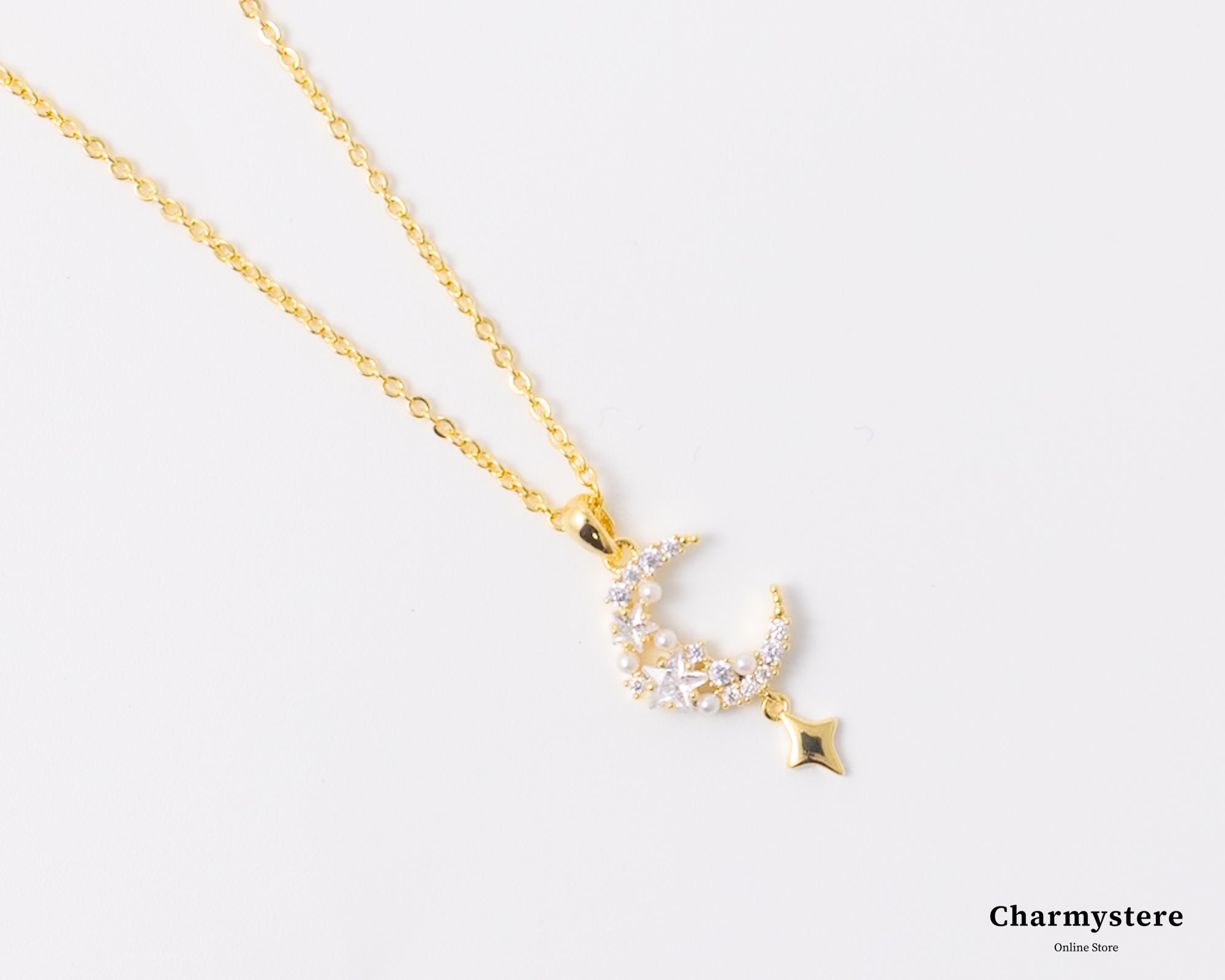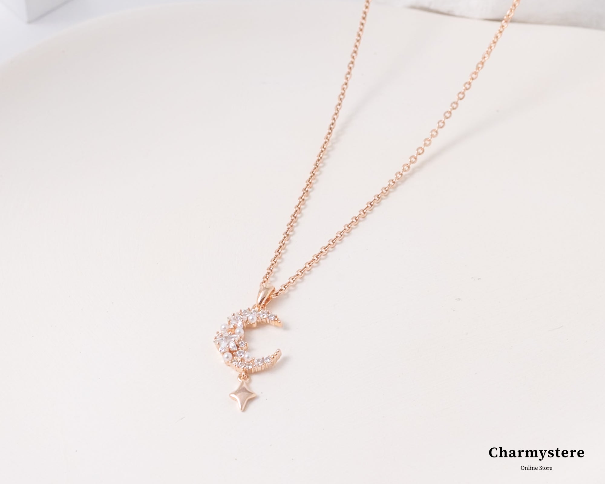 幻想的でエレガントなロマンチックなデザイン。繊細なチェーンに、美しく煌めくストーンの月と星のモチーフがあしらわれています。