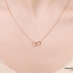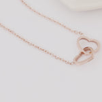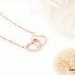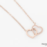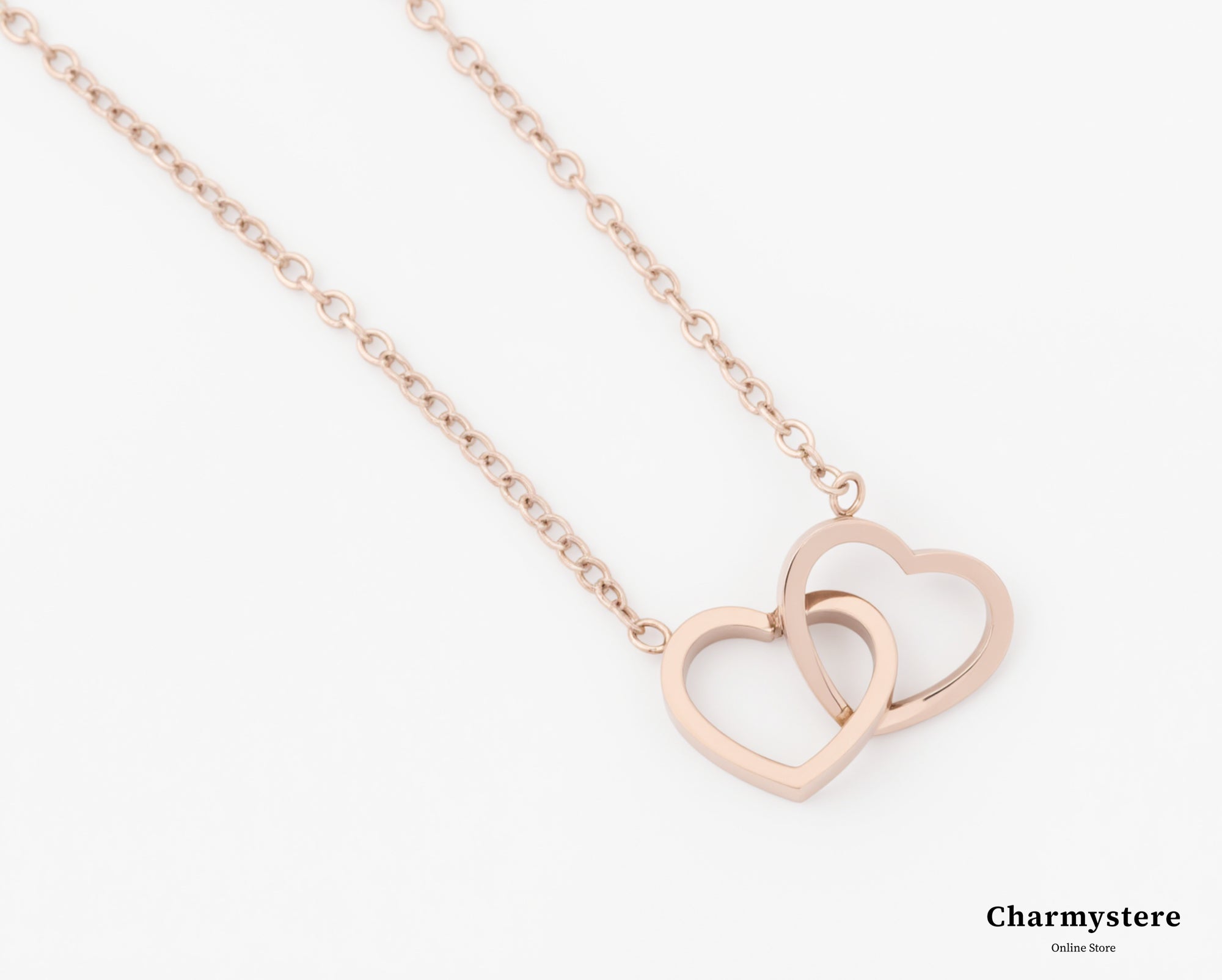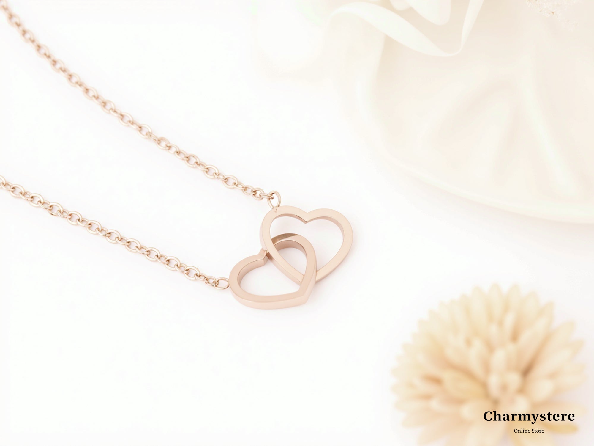 交差する2つのハートをデザイン。2つの心が出会い、結ばれることを象徴しています。繊細なチェーンのデザインが全体をよりシンプルでエレガントに見せています。