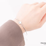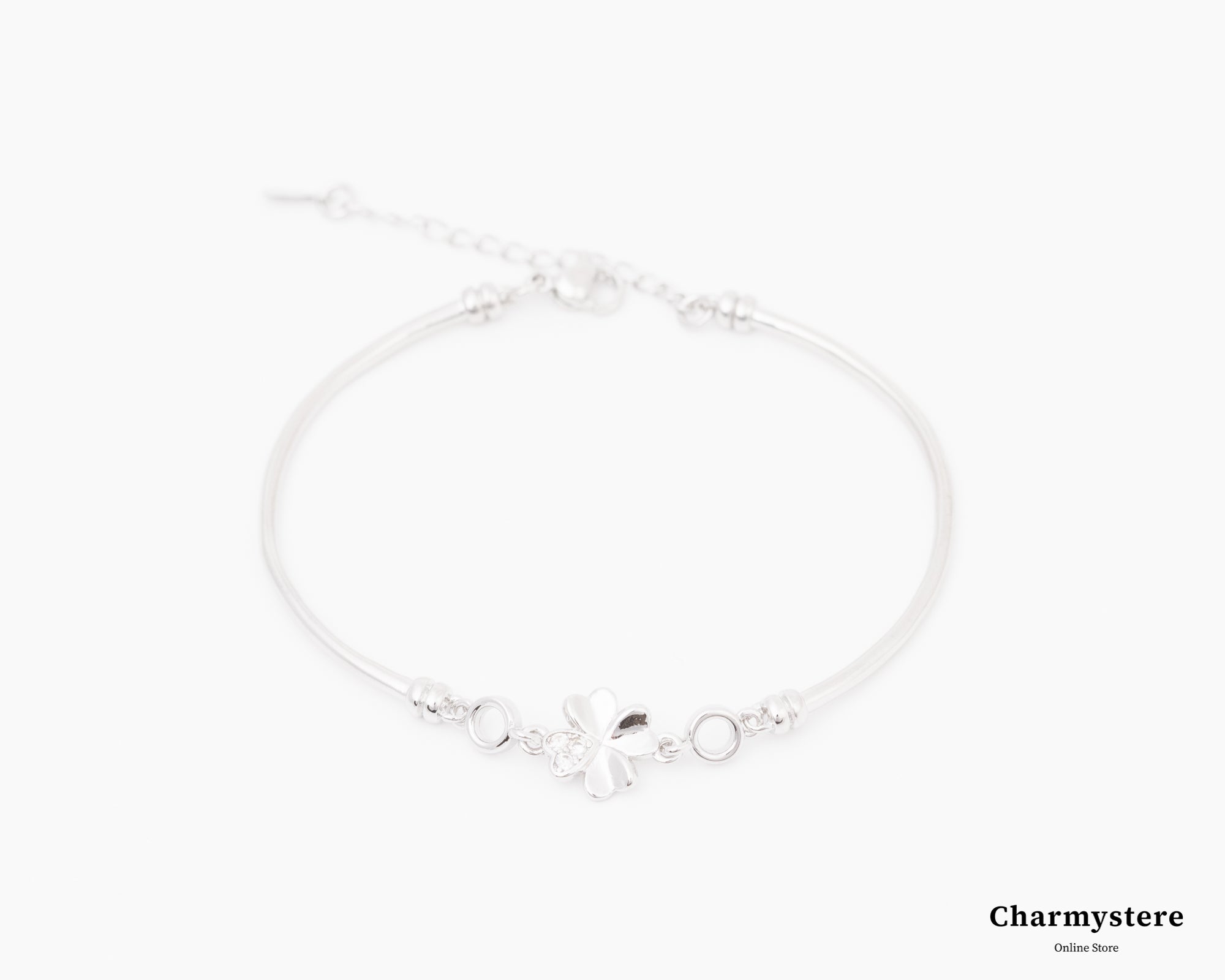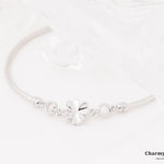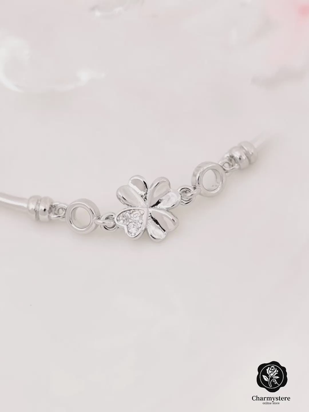 クローバーの幸せ運ぶ幸運モチーフを使ったブレスレット。チェーン部分は一般的なチェーンは使わずバングルのようなデザインに。