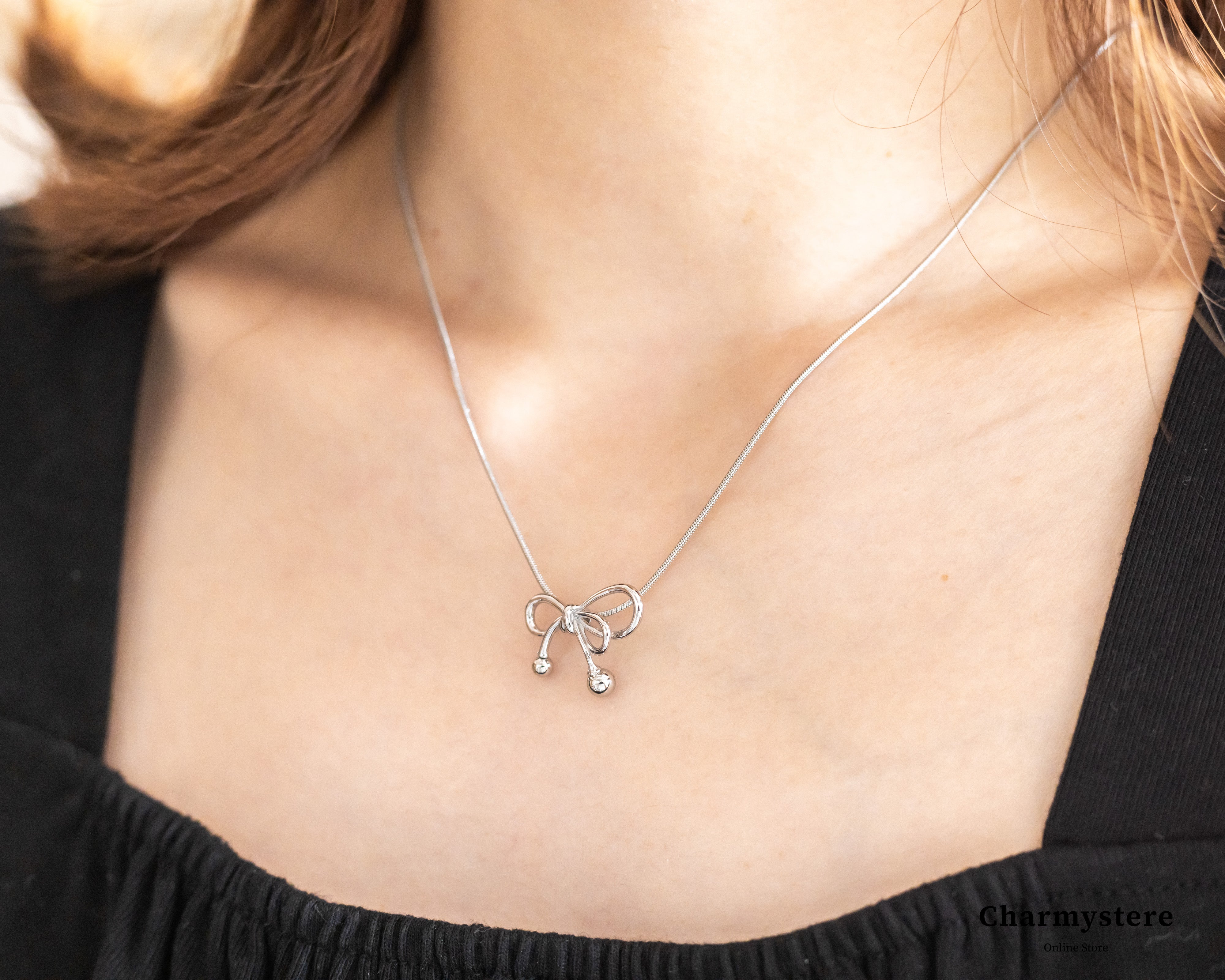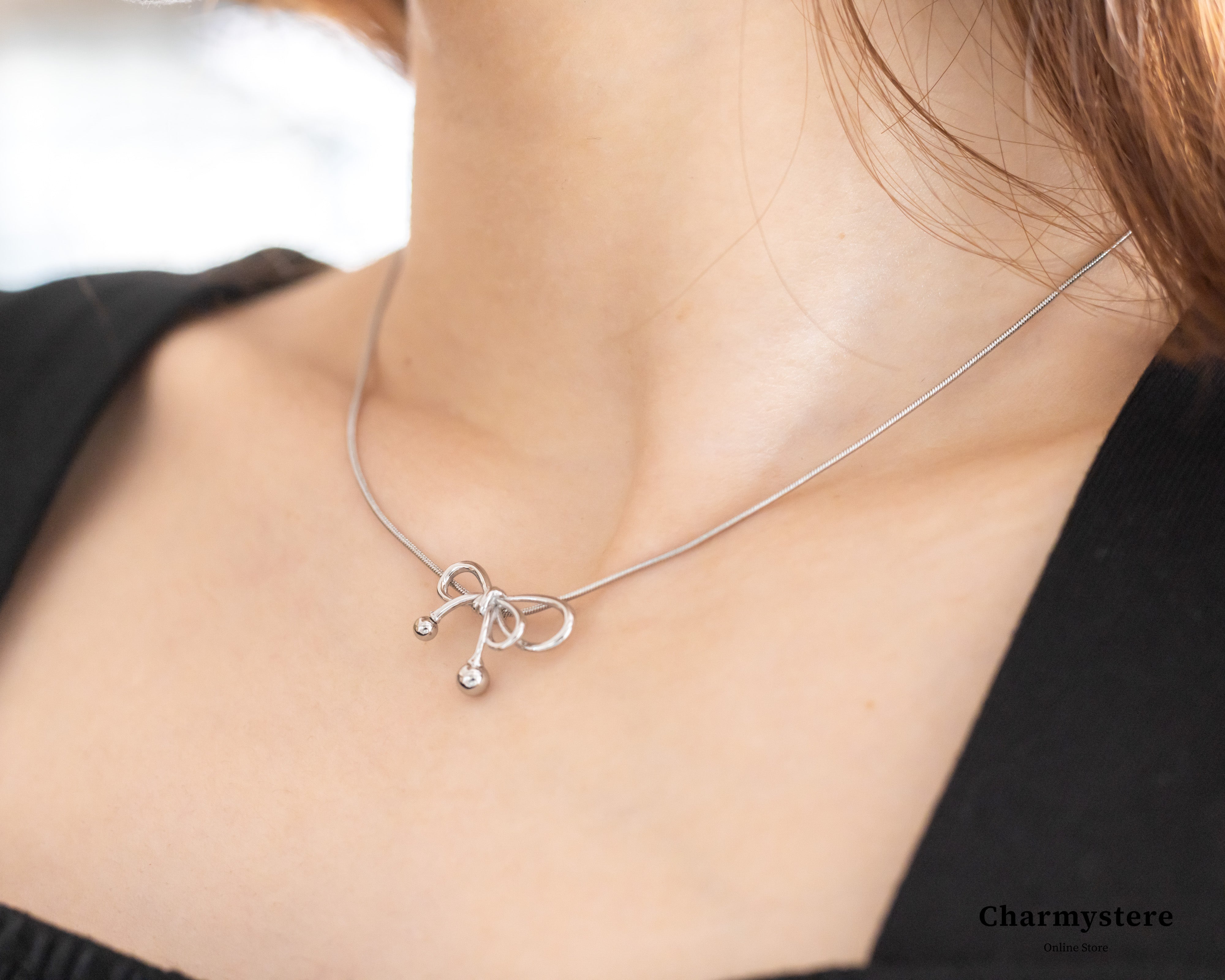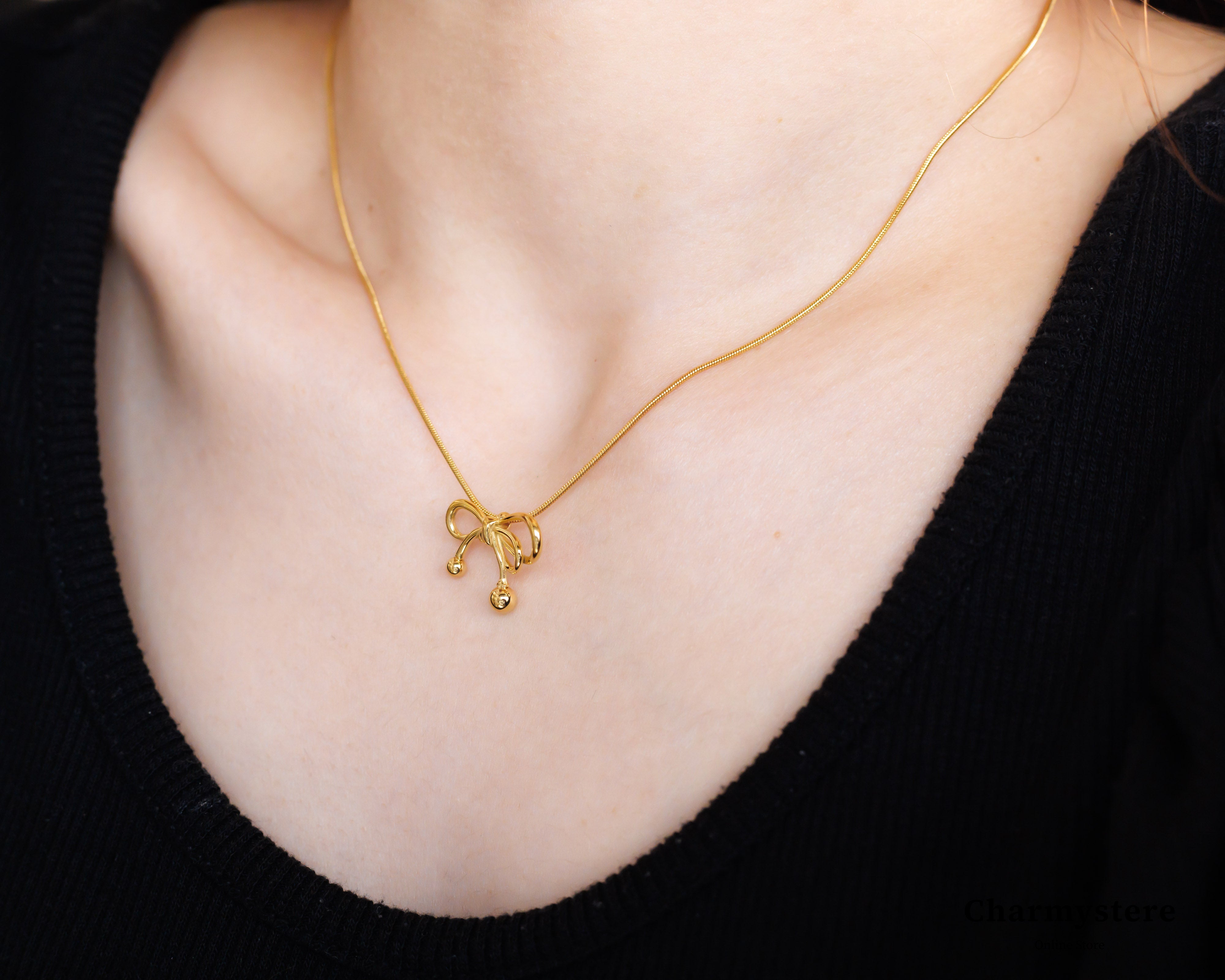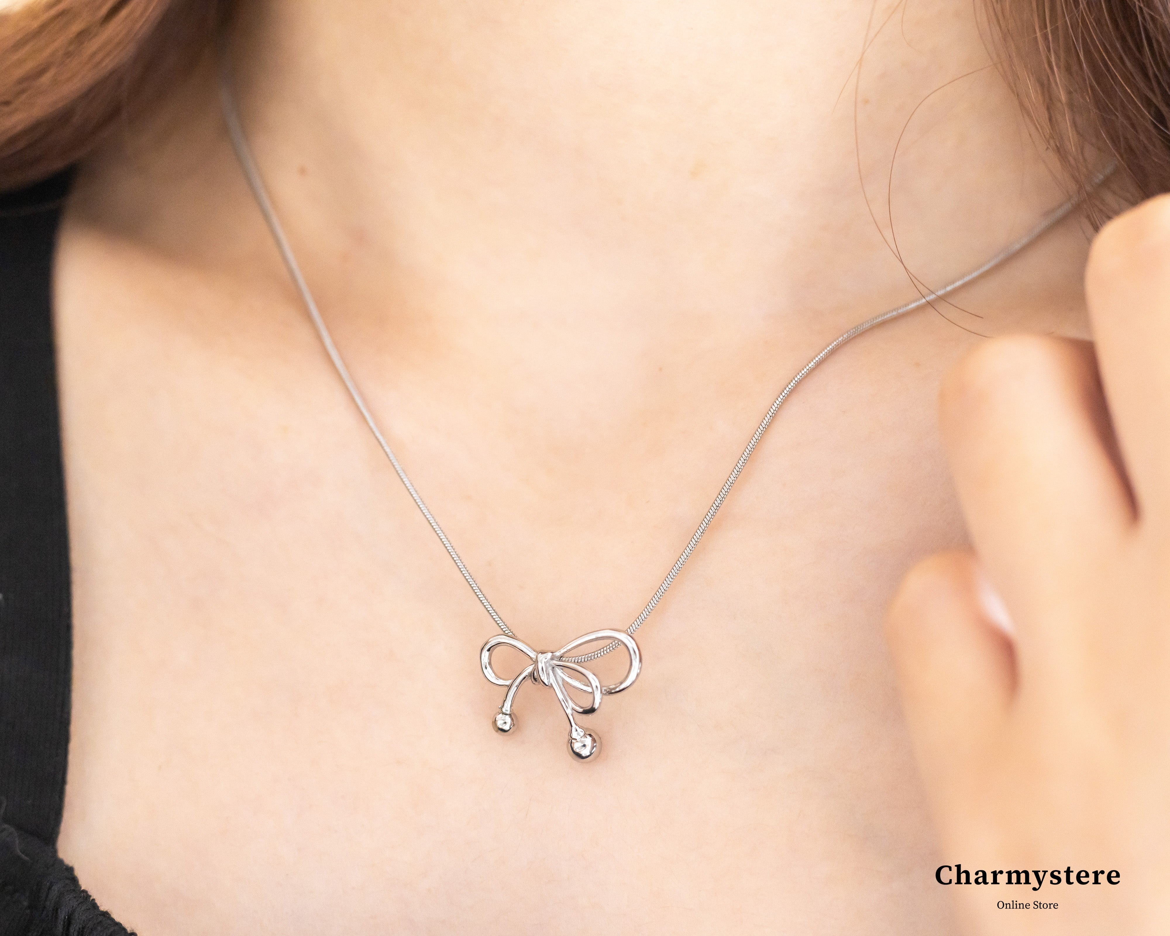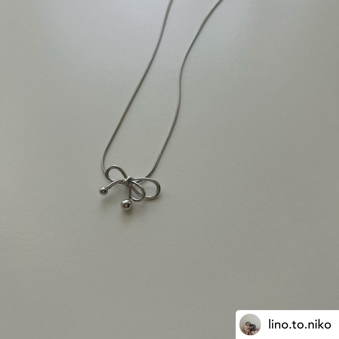 シンプルな質感のネックレスにリボンのデザインを組み合わせた大人可愛いアイテム。ファッションのアクセントに最適。