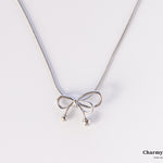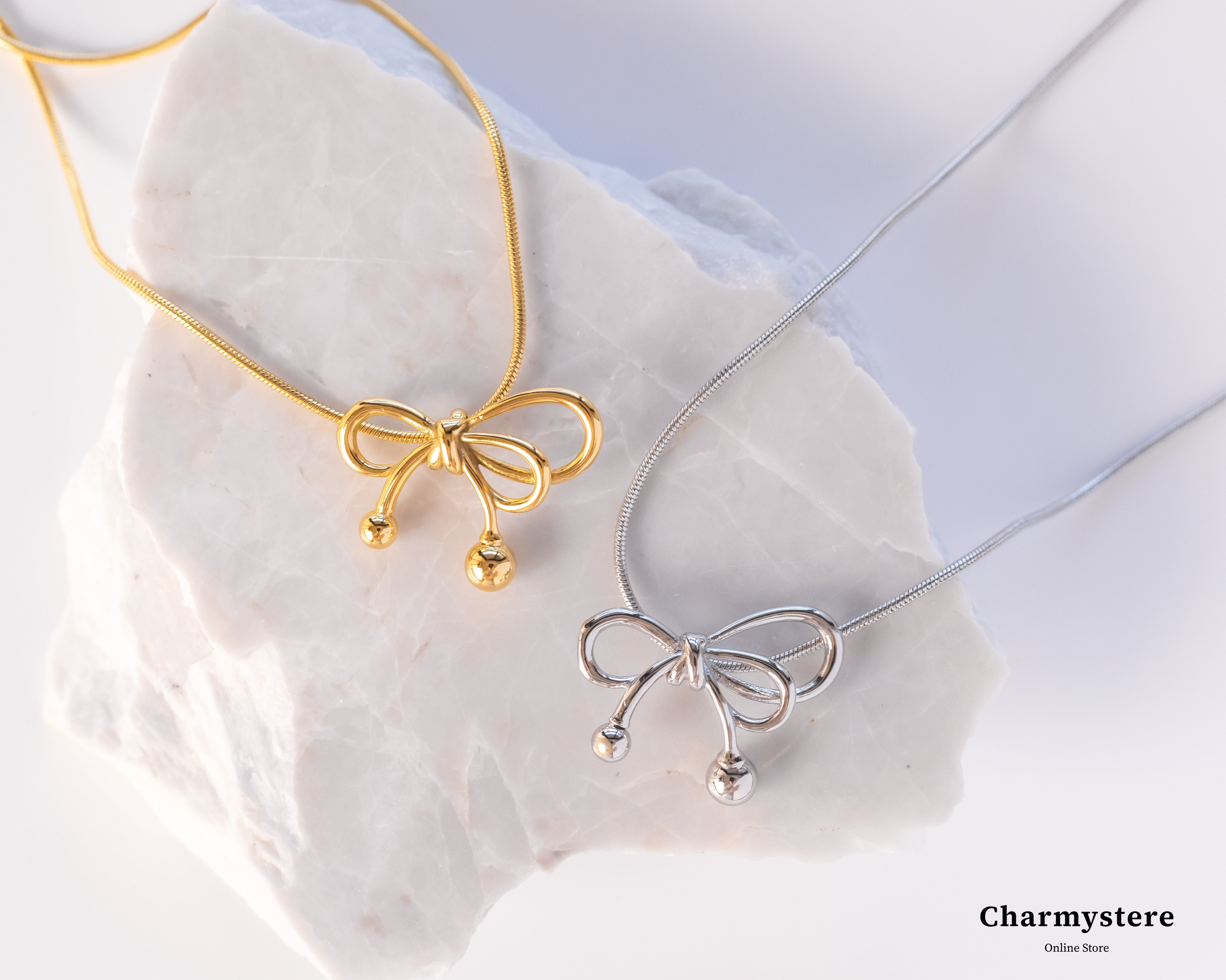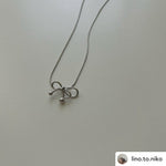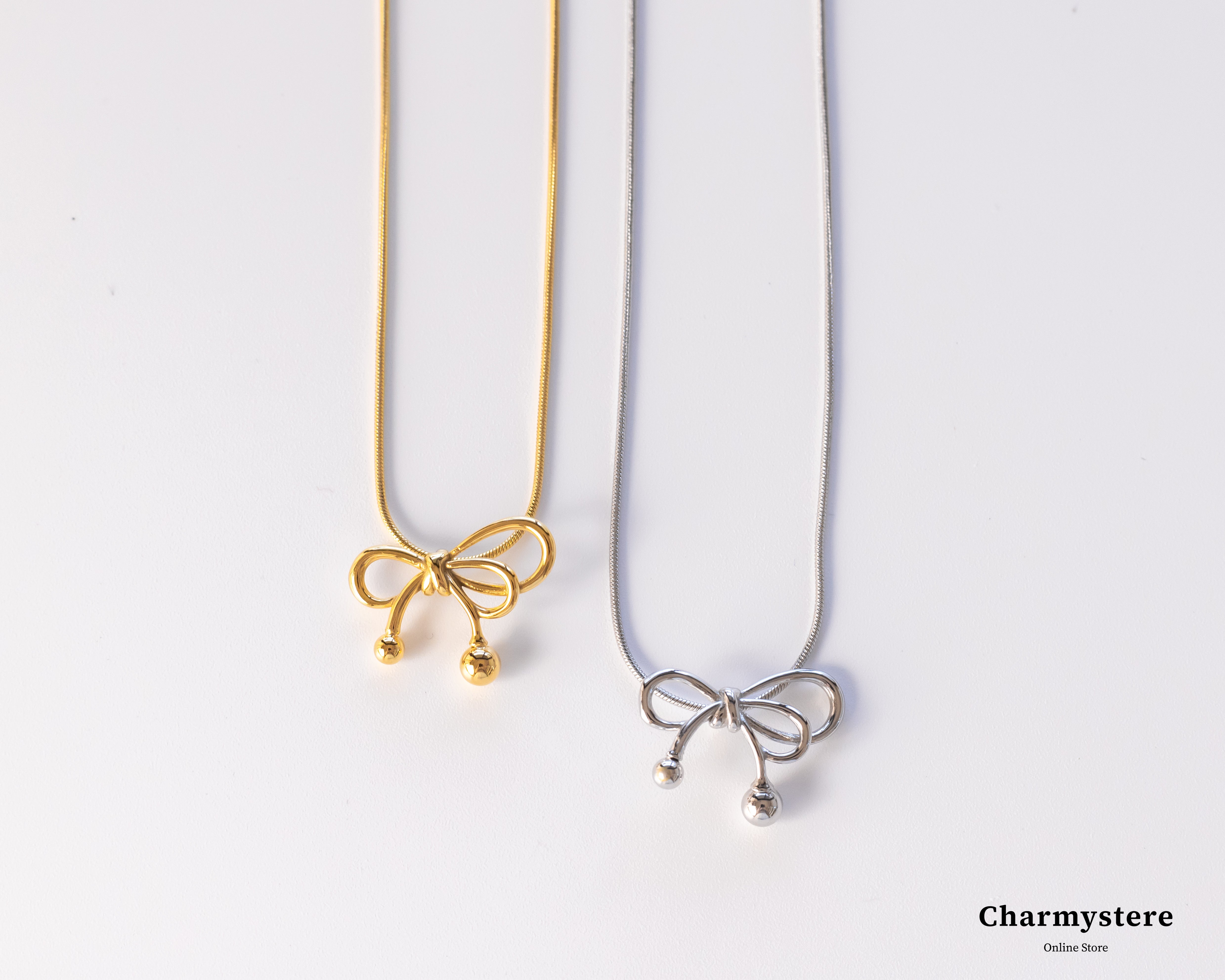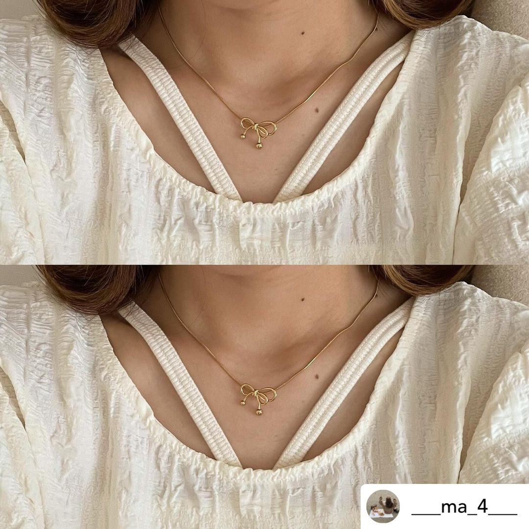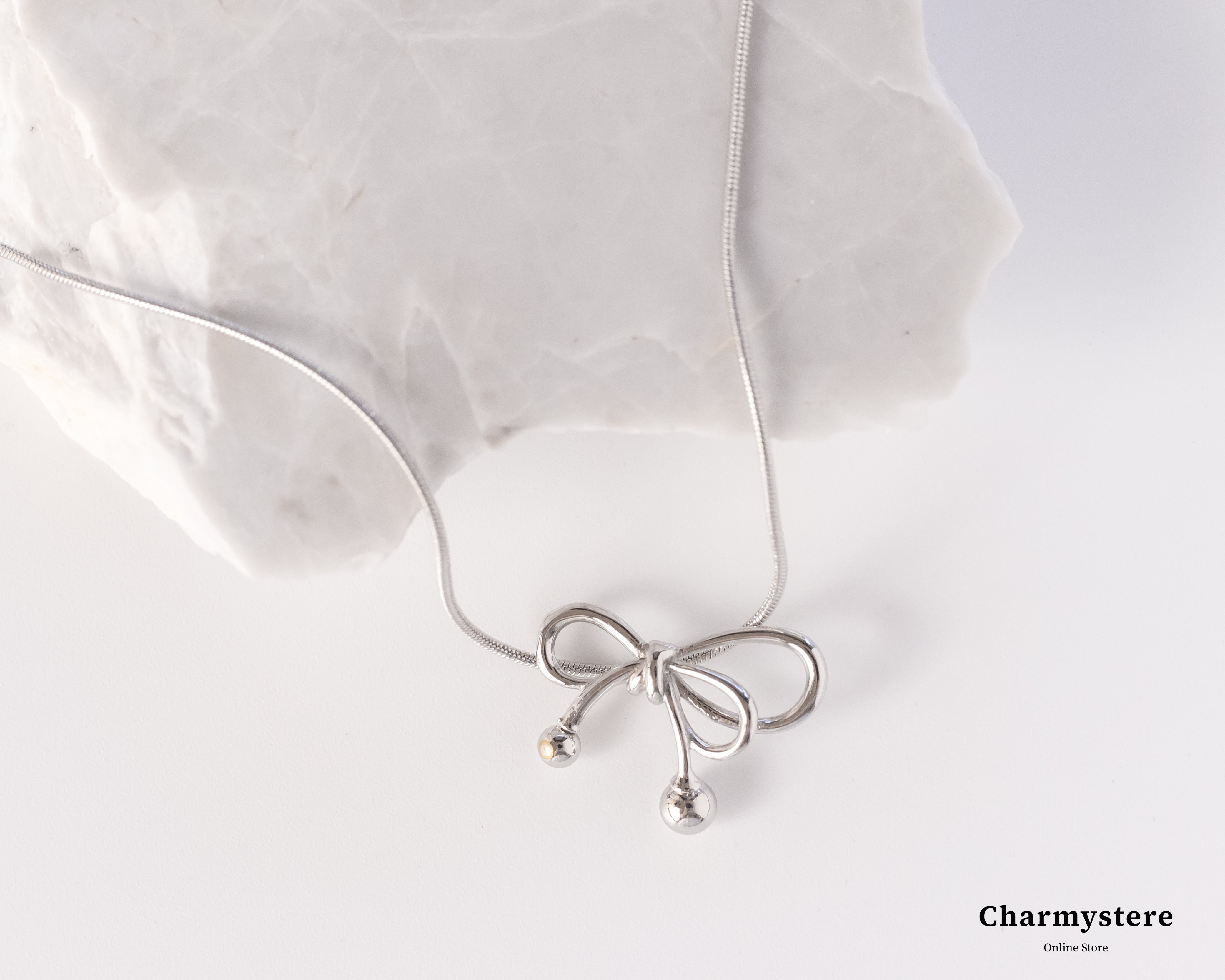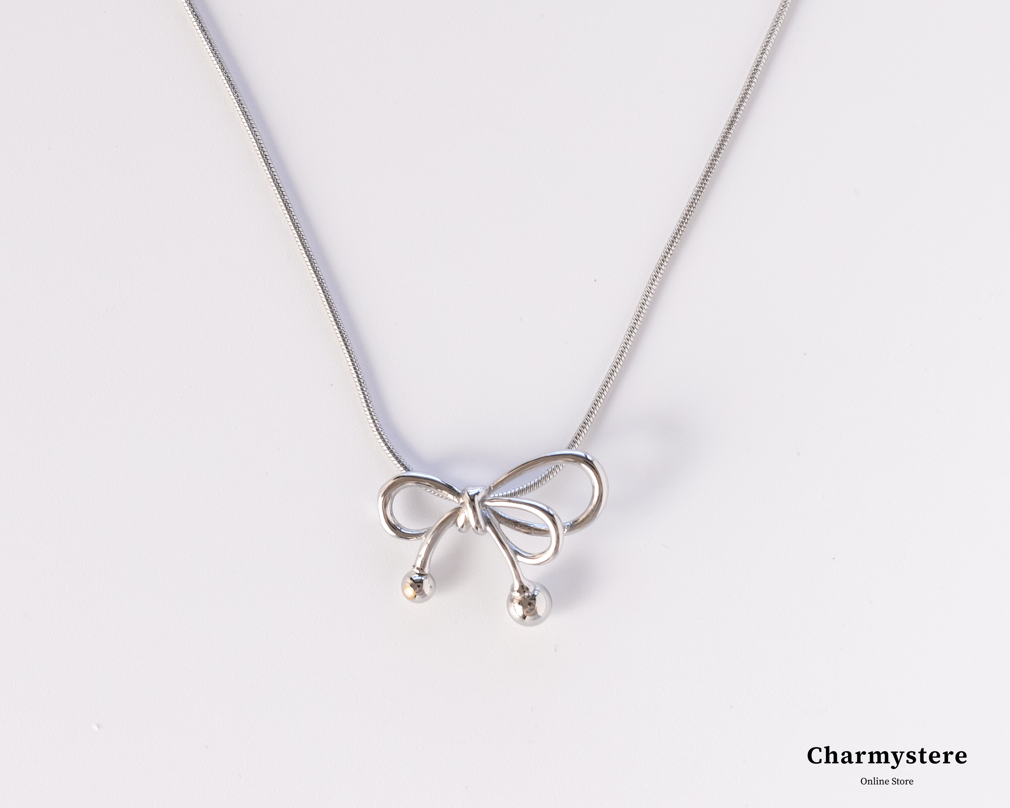 シンプルな質感のネックレスにリボンのデザインを組み合わせた大人可愛いアイテム。ファッションのアクセントに最適。