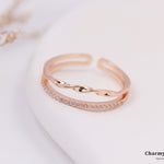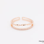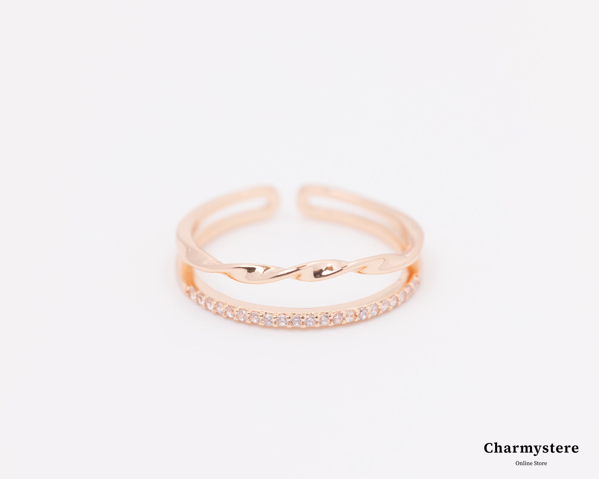 モダンでエレガントなツイストのレイヤードリング。手元にスタイリッシュな輝きをプラス。このリングは、2つの異なるデザインが重なり合ったデュアルレイヤー構造が特徴で、1本で2つの異なる魅力を楽しむことができます。ローズゴールドの仕上げが、上品で洗練された印象を与えます。