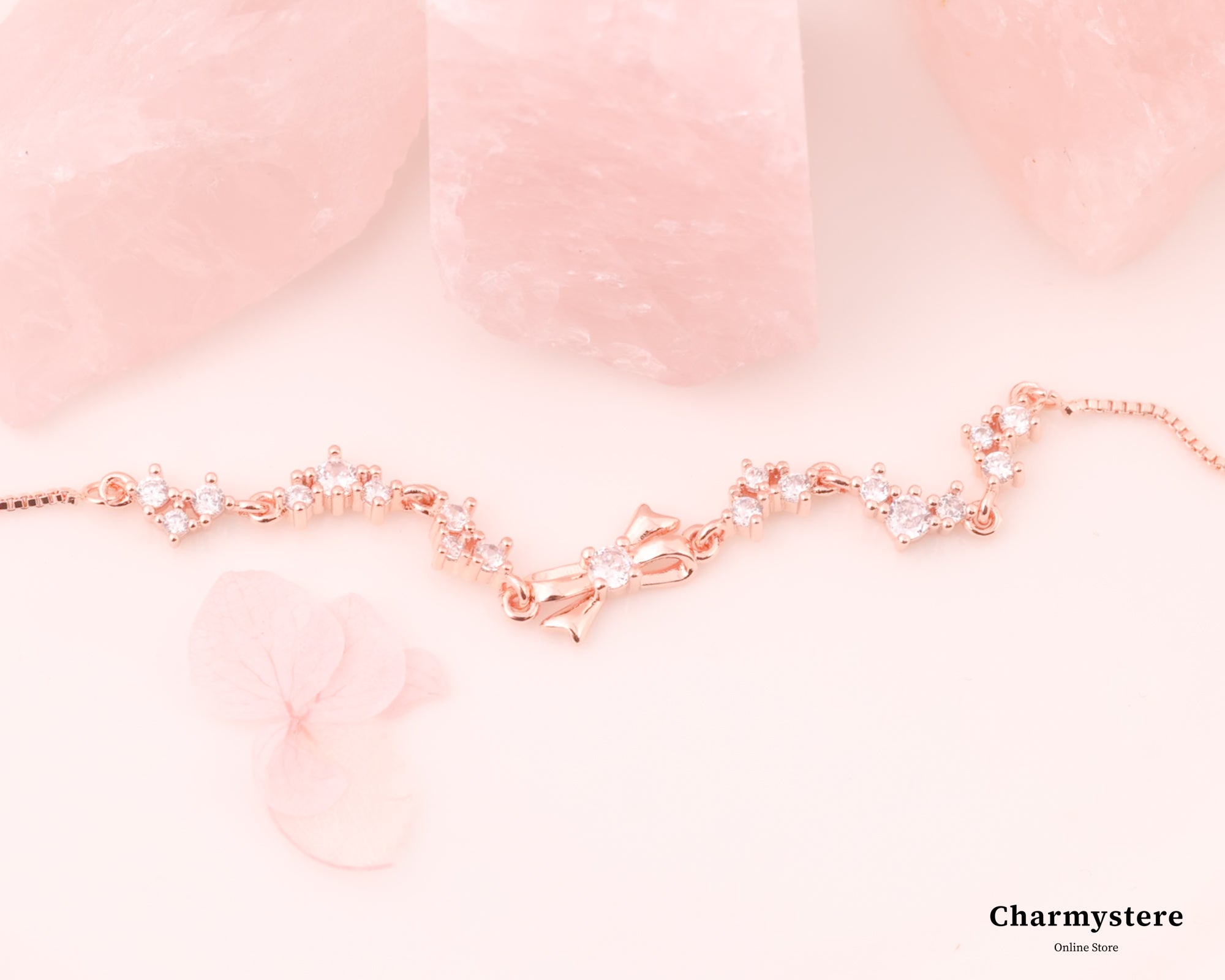 リボンのフェミニンなモチーフが大人可愛いを演出し、キラキラ煌めくストーンが埋め込まれたパーツが組み合わさりチェーンのように連なる華やかなブレスレット。普段使いにはもちろん、お出かけやお呼ばれにも◎