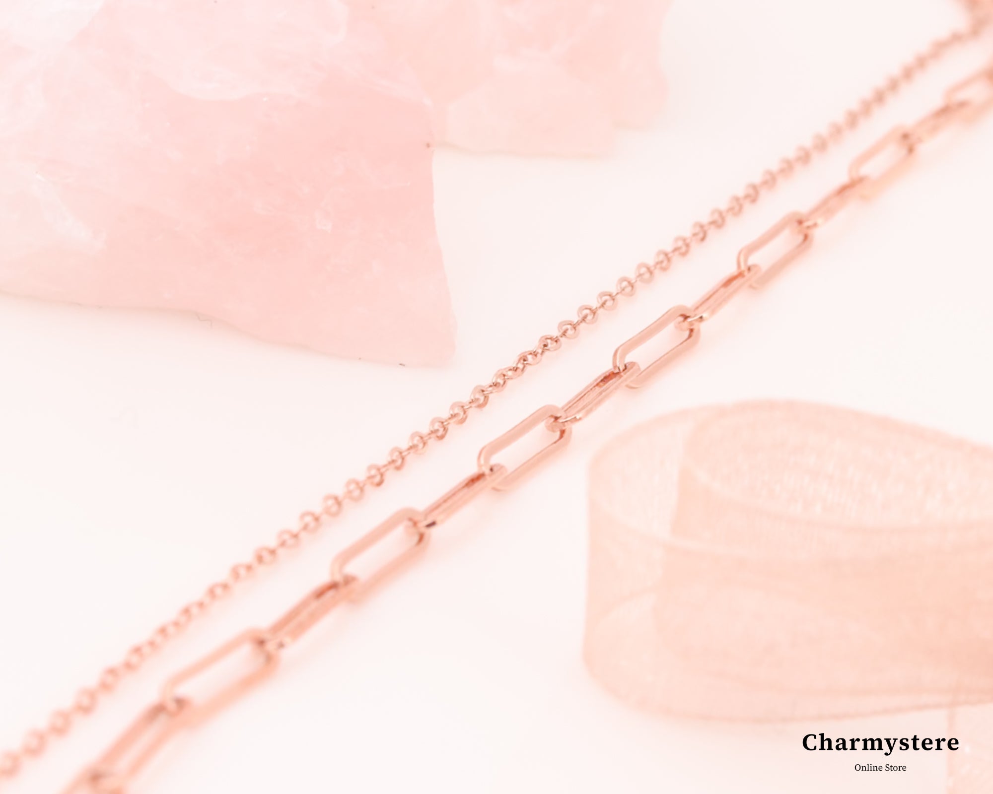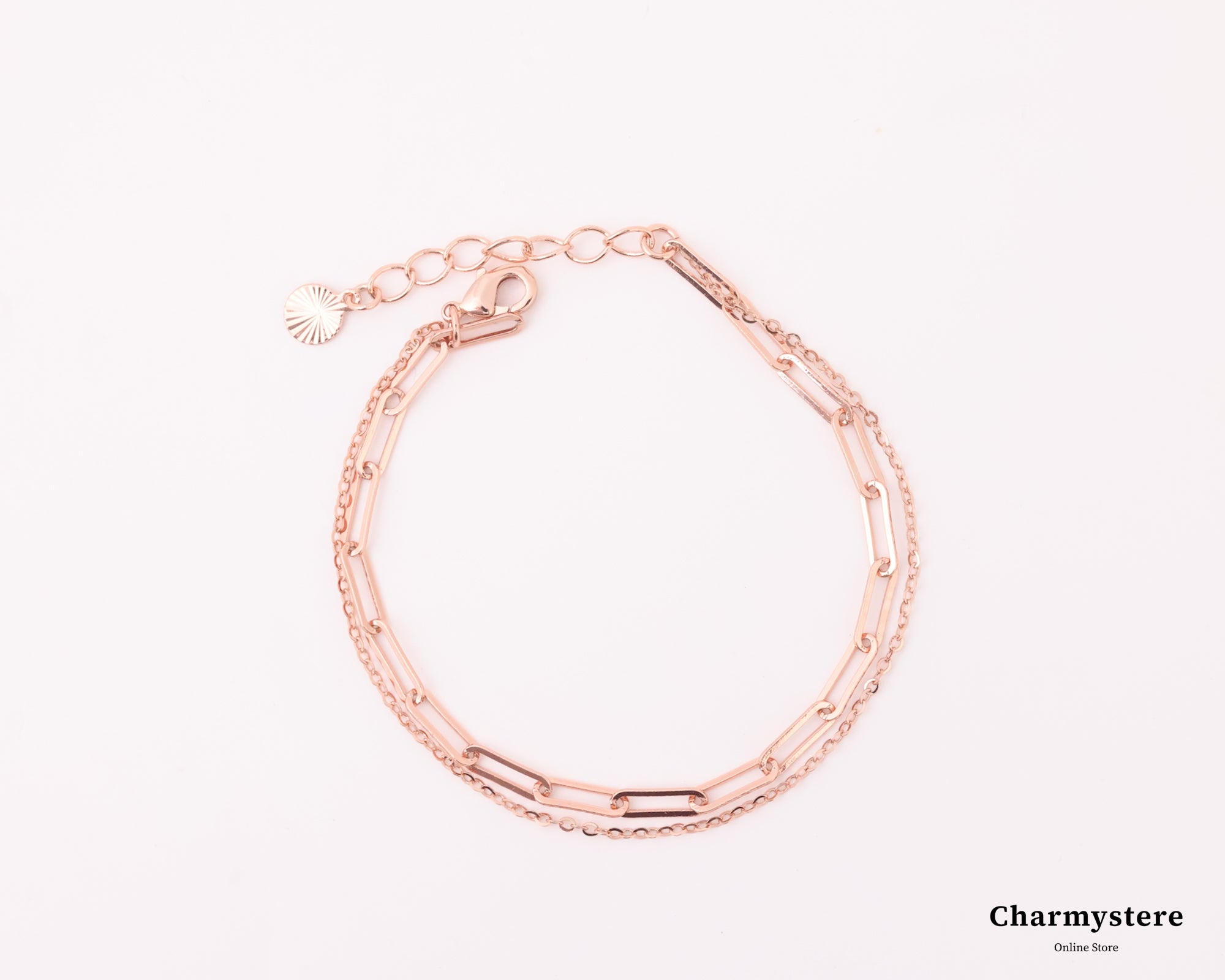 細く華奢なチェーンと存在感あるカジュアルチェーンが組み合わさったレイヤードが叶うブレスレット。シンプルながらもデザイン性があり、普段使いにぴったりなアイテム。