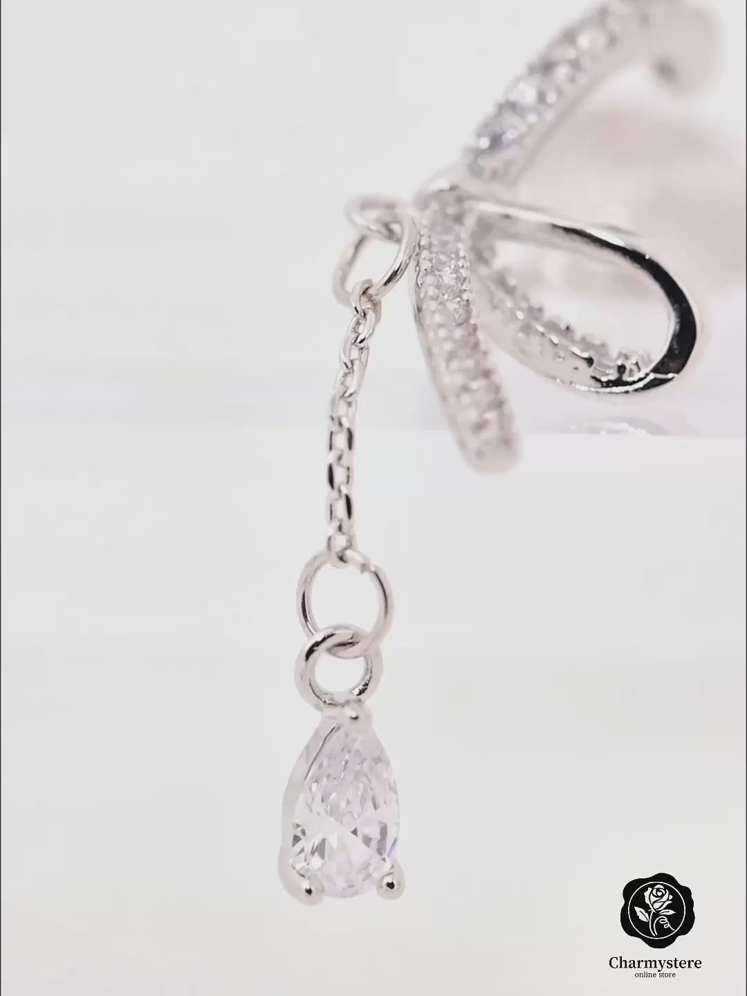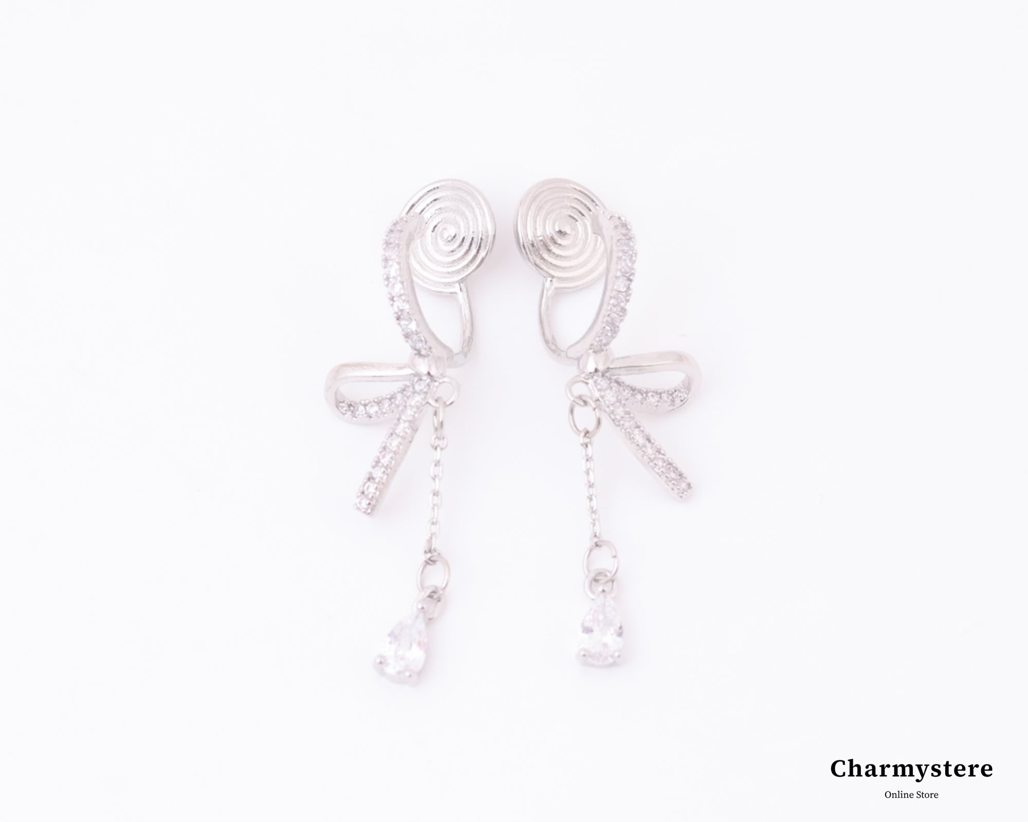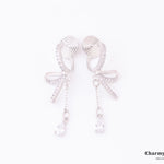 立体感あるリボンモチーフに、ドロップストーンが吊り下げられた優美なイヤリング。フェミニンなシルエットで華やかなデザイン。