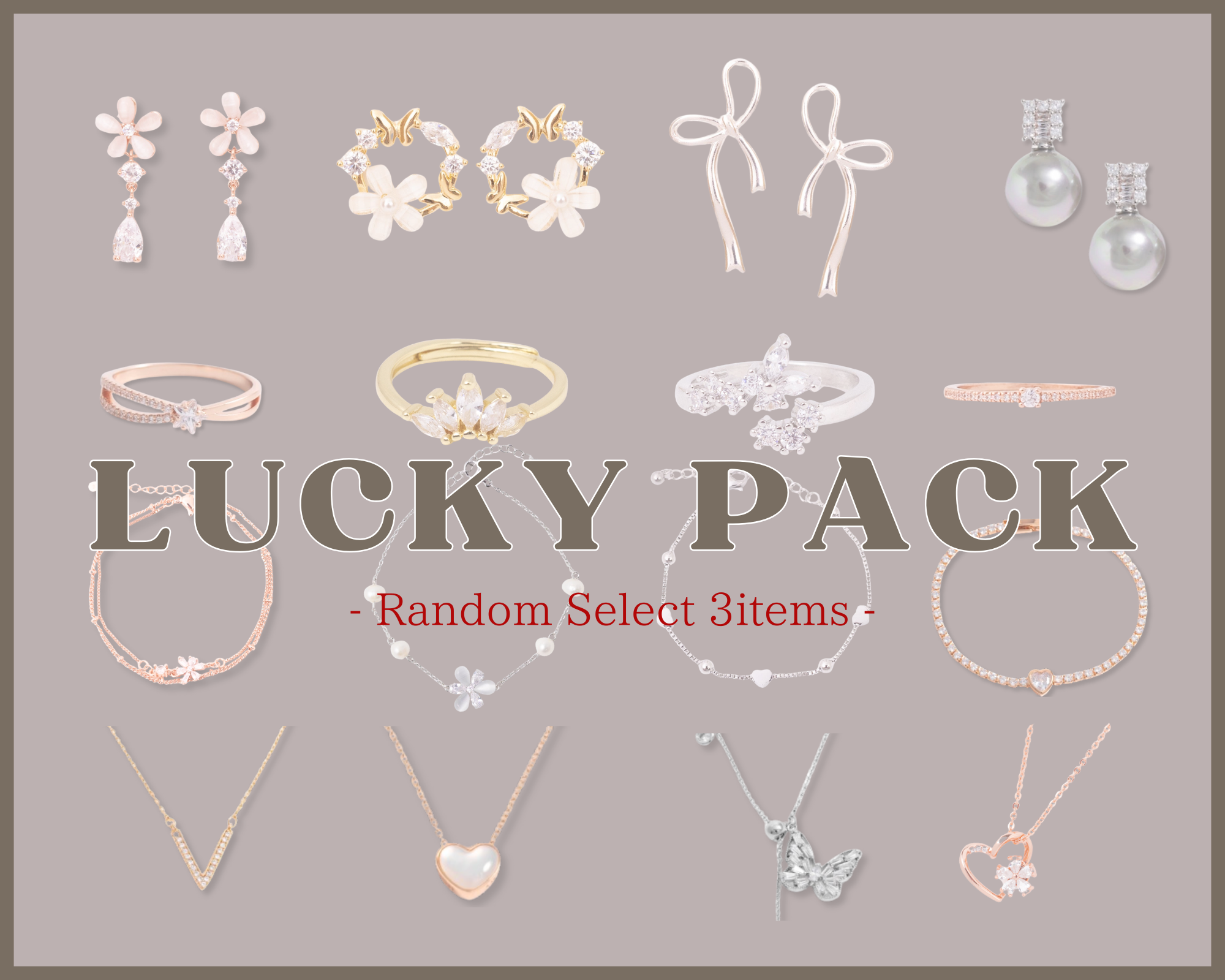 ・ネックレス、ブレスレット、バングル、リング、ピアス、イヤリング、イヤーカフ、アンクレットからランダムで3点セレクト。