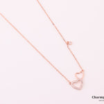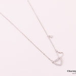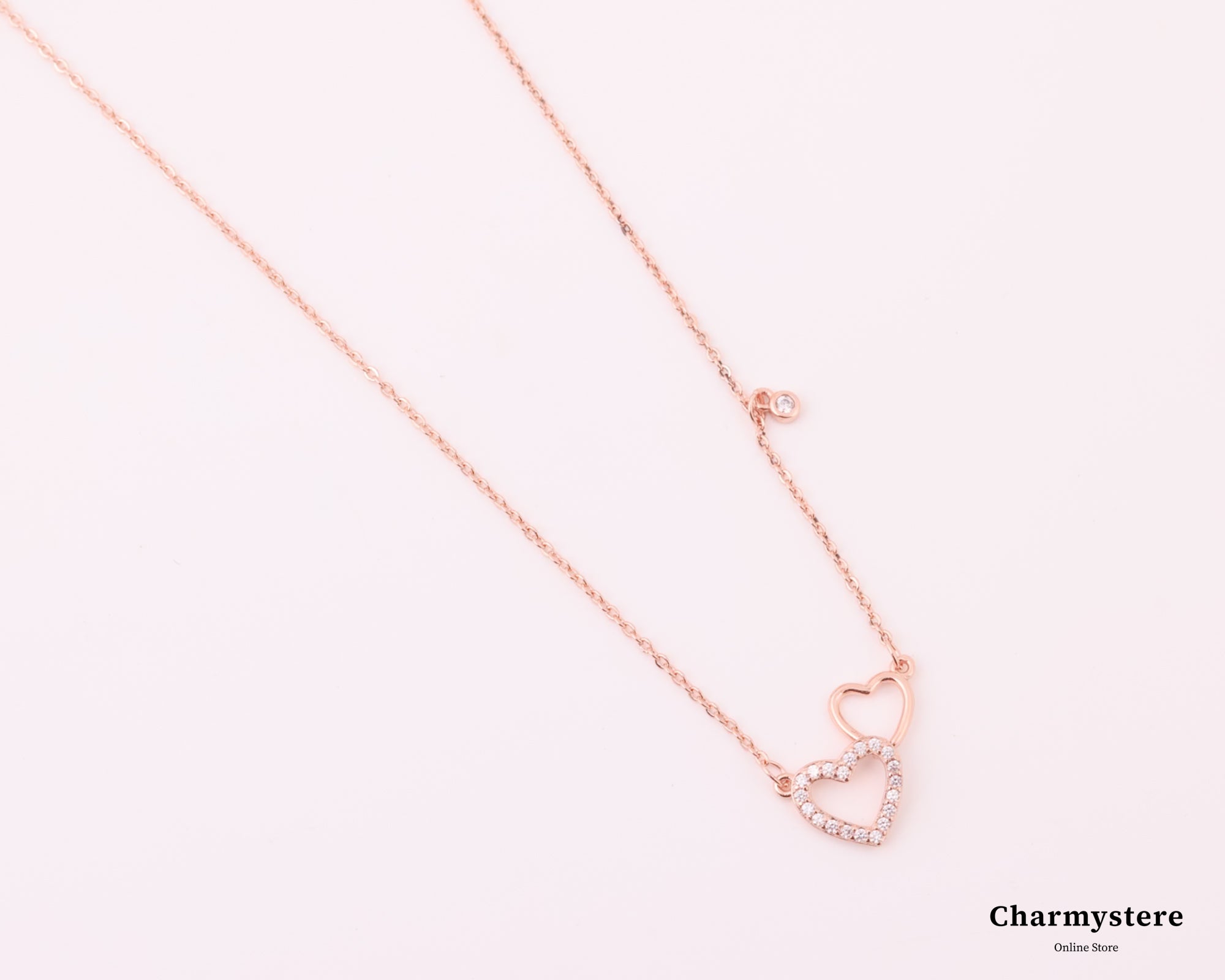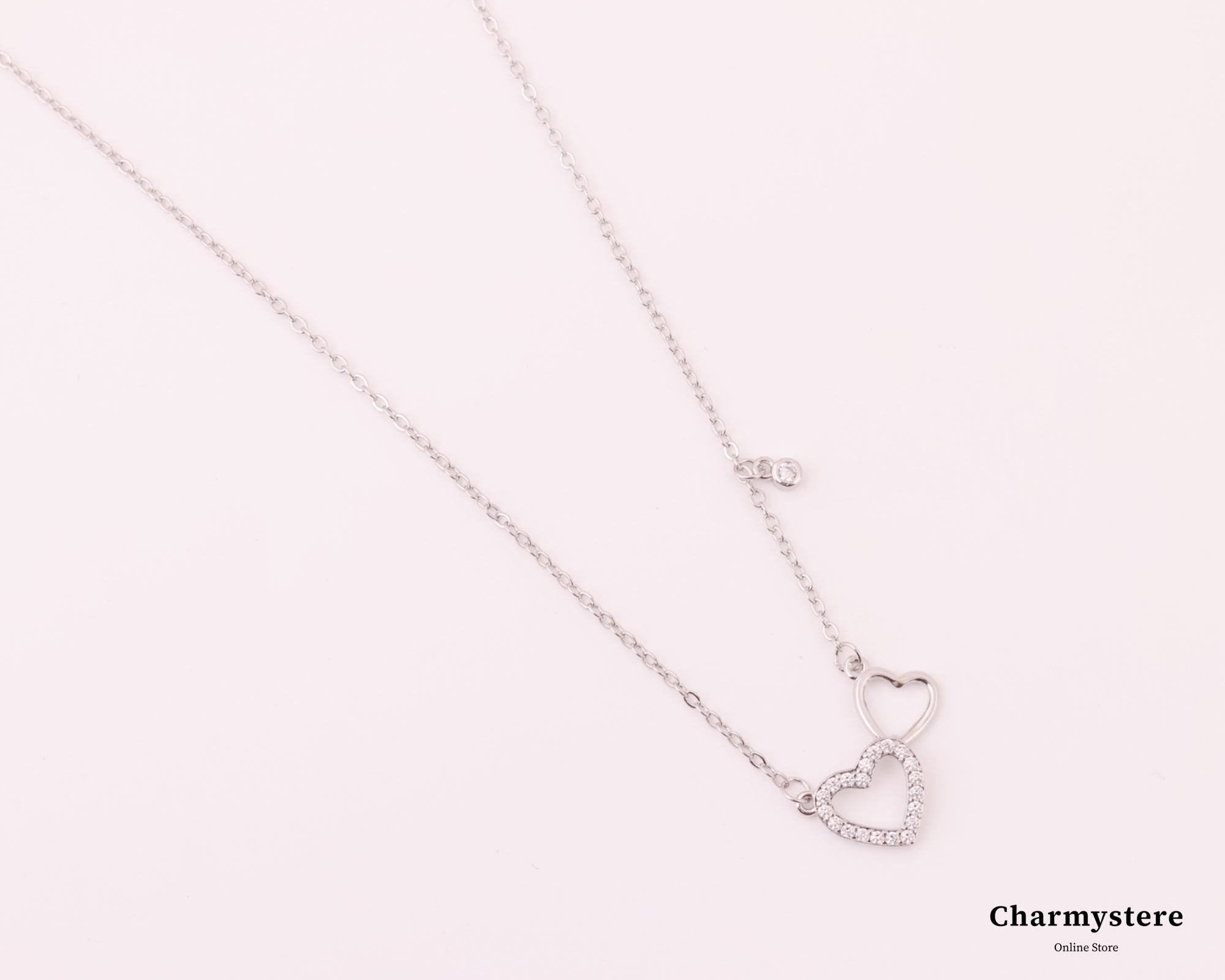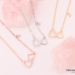 ロマンチックなダブルハートデザインが特徴の愛と永遠の絆の意味を込めたネックレス。輝くストーンで縁取られたハートとシンプルな輪郭のハートで組み合わせ、究極のミニマルな美しさを表現。繊細なチェーンには透明感あふれる小さなラウンドストーンのチャームも飾られ、全体のデザインに動きと優雅さをプラス。
