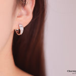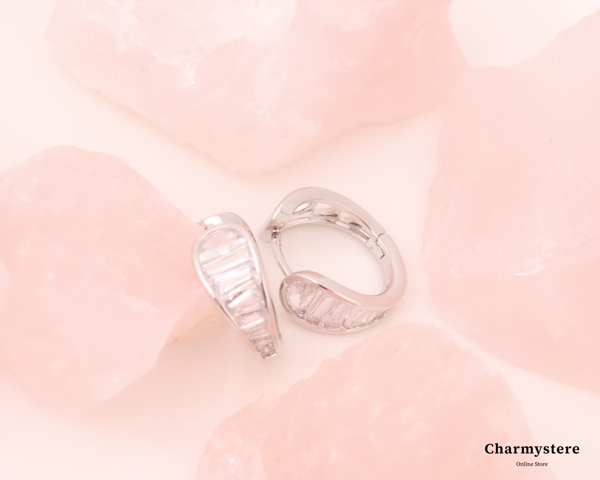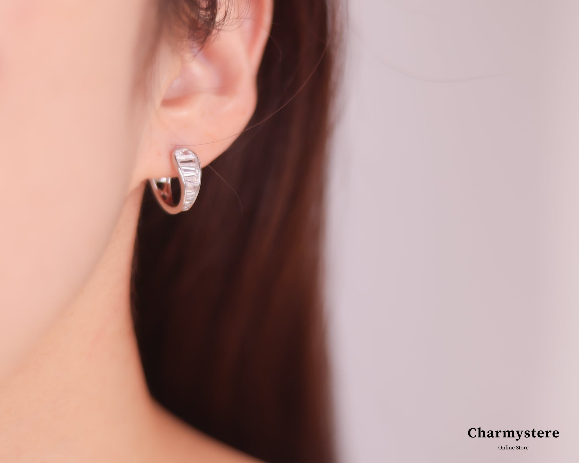 シンプルながら、キラキラと煌めくストーンの幅が広めに設計され、存在感のあるピアス。キャッチレスなハギーピアスのため普段使いしやすいアイテム。