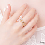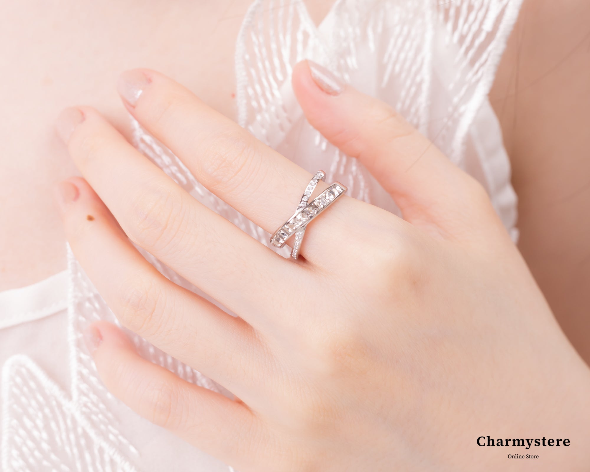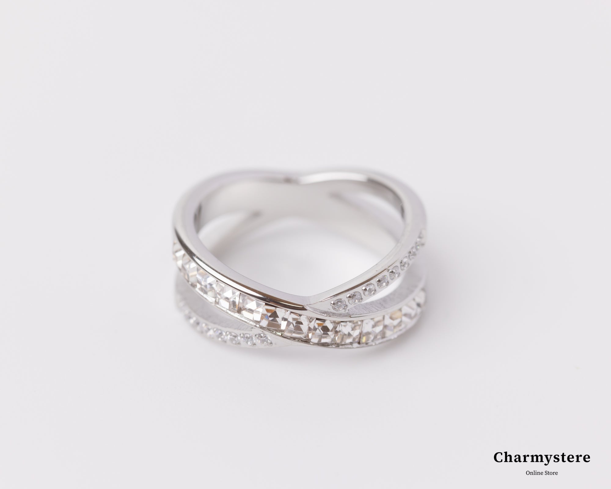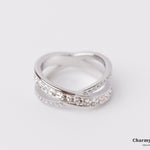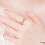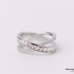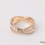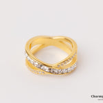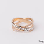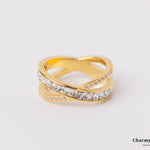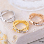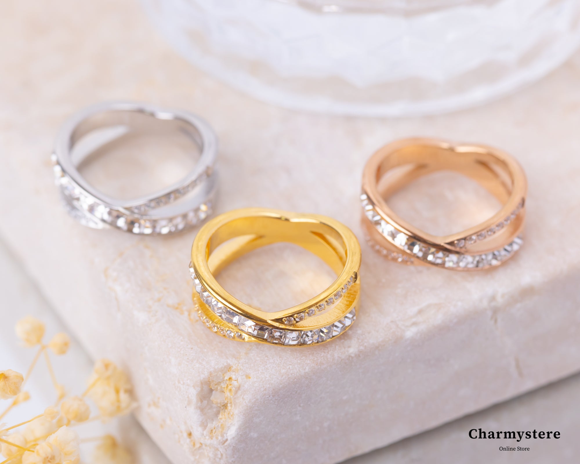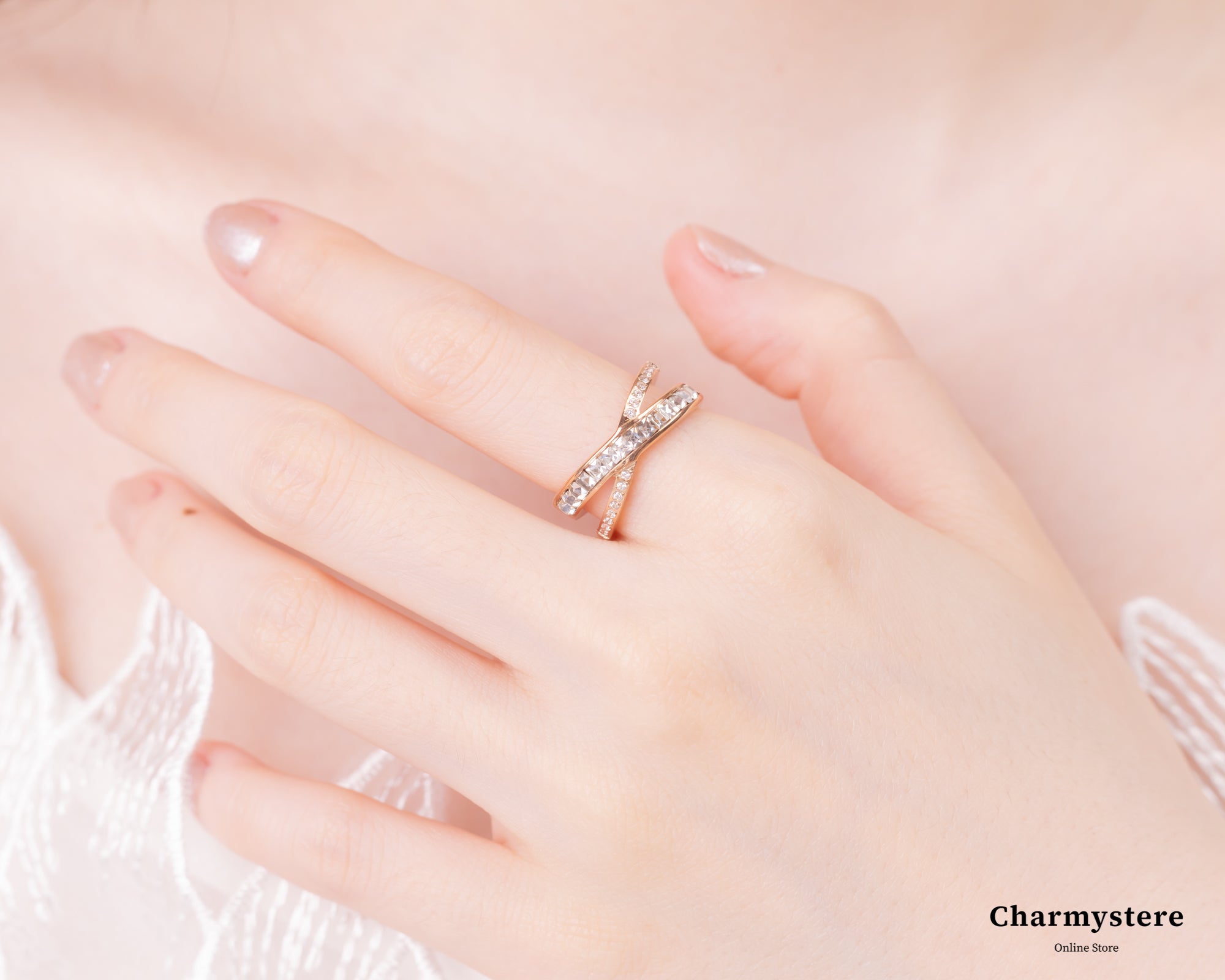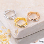 2本の異なるラインがクロスしたデザイン。シルバー、ゴールド、ピンクの3色展開。多様なスタイルに合わられる万能なリング◎